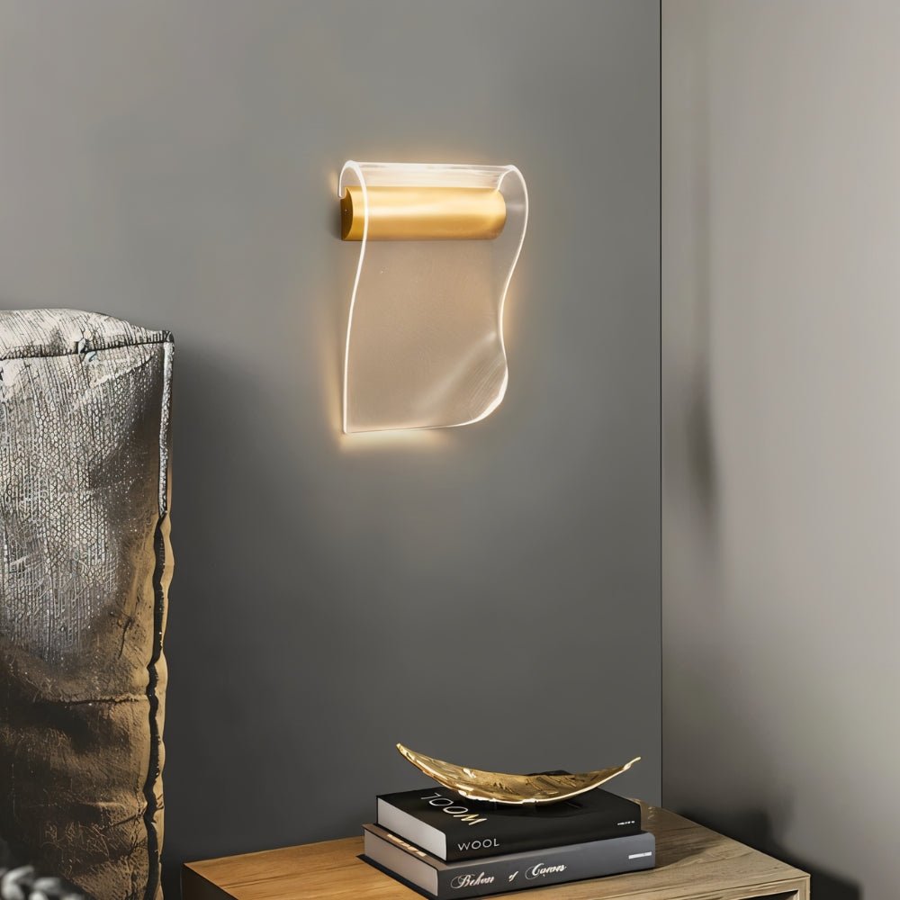 The Sheets wall lamp is a modern light fixture crafted from iron and acrylic, featuring a sculptural, flowing design. Its translucent acrylic sheet wraps elegantly around a cylindrical iron base, emitting a soft glow through an energy efficient light source. It delivers ambient illumination with artistic appeal. Perfect for living rooms, bedrooms, hallways, or staircases, it adds a refined and contemporary touch to any wall.