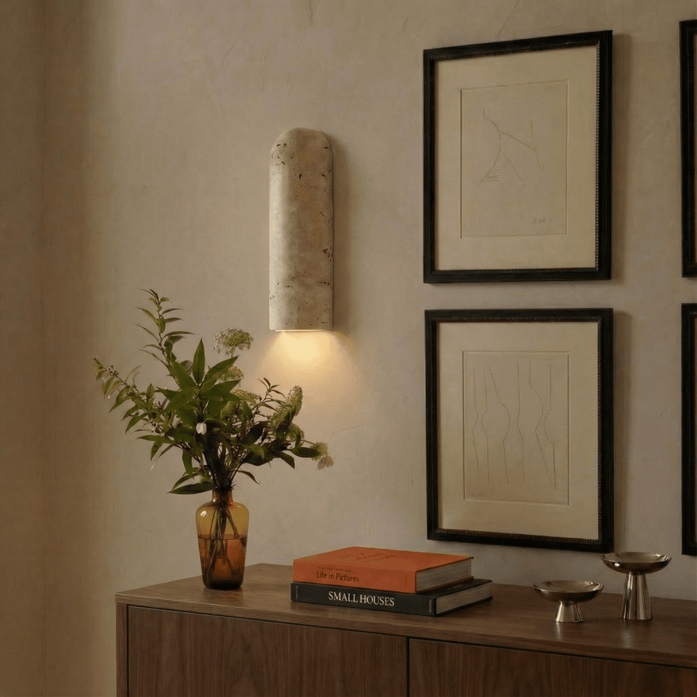 Durable travertine wall lamp provides diffused, sophisticated lighting that enhances ambiance — perfect for living rooms, hallways, or bedrooms with a touch of organic elegance.