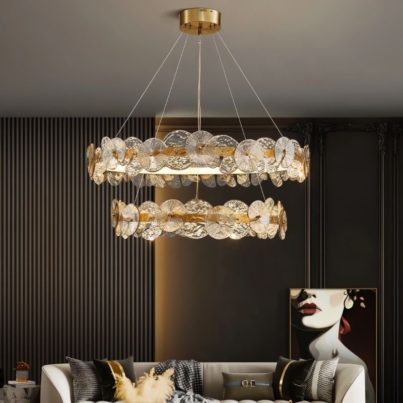 The Sovian Chandelier is a statement light fixture crafted from glass and metal, featuring a dual-ring design with textured glass discs that scatter light dynamically. Suspended by fine cables, its floating structure adds depth to dining rooms, living spaces, or high-ceiling foyers. The layered composition enhances ambient lighting while maintaining an airy elegance. Available in three sizes, it adapts to varied interiors, from modern to luxe decor. Ideal for those seeking a sculptural centerpiece with refined illumination.