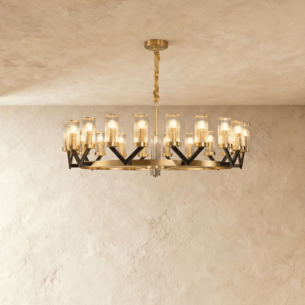 The Sovra Chandelier is a refined light fixture crafted from copper and glass, showcasing a luxurious gold finish with fluted cylindrical shades. Its geometric black-and-gold frame delivers a striking visual rhythm, combining symmetry and elegance. Available in both linear and round sizes, it complements dining areas, foyers, or living spaces with contemporary sophistication. The fixture’s precision detailing and vertical suspension enhance modern interior compositions. Ideal for ambient lighting in upscale residential or hospitality environments.