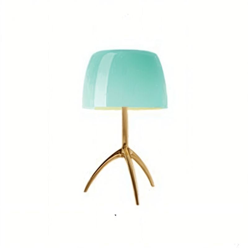 The Splendore Table Lamp features a blown glass shade with a polished finish, complemented by a white inner layer and a colorful outer layer. The base is available in polished chrome or copper, and the lamp is supported by a futuristic-looking metal tripod. For installation, simply place it on any surface like a desk or shelf, plug it into an electrical socket, and use the attached button to turn it on. For safety and optimal performance, we recommend using a professional installer.