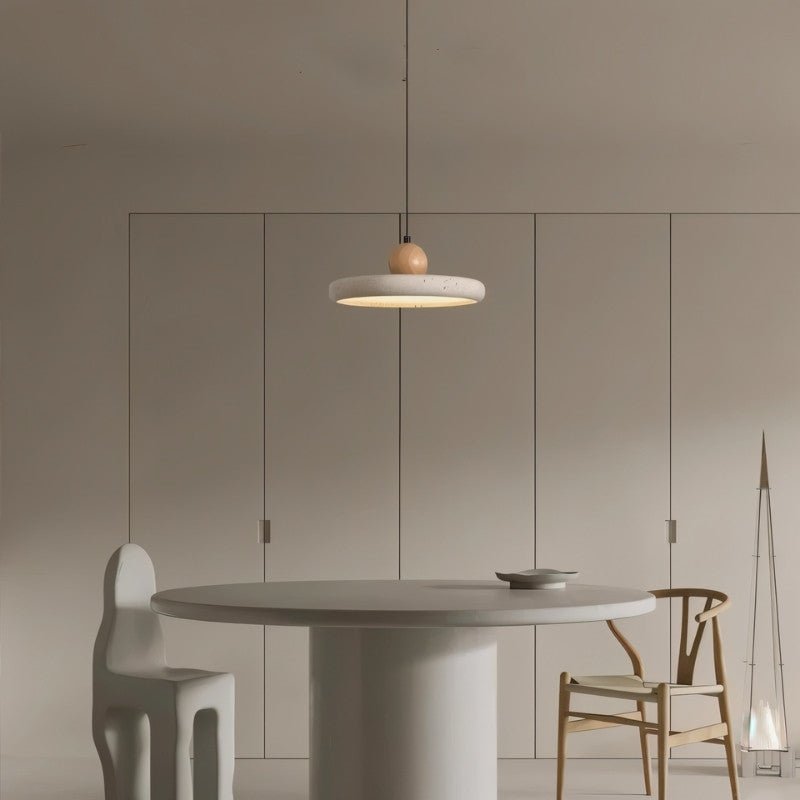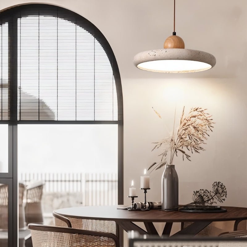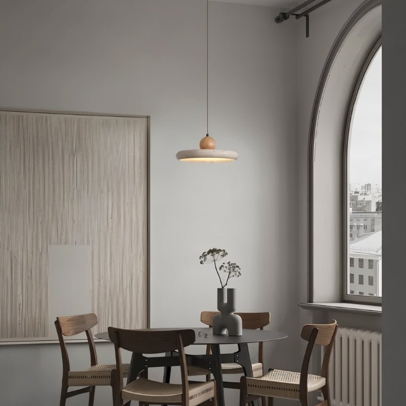 Travertine and wood pendant delivers focused, ambient lighting with an earthy elegance — perfect for dining areas and living spaces.