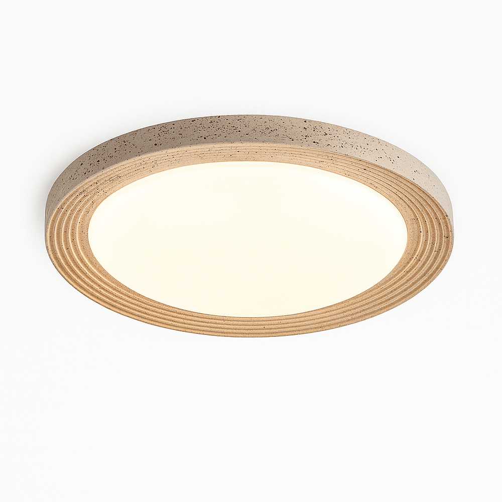 The Varena ceiling light is a refined light fixture that blends natural textures with modern elegance. Crafted from travertine, it showcases a warm, earthy tone with subtle stone detailing, adding a touch of organic sophistication. The circular frame surrounds a soft diffused panel, ensuring even, glare-free illumination. Its flush-mounted design enhances the space with a clean and understated aesthetic, making it an ideal lighting solution for contemporary interiors.