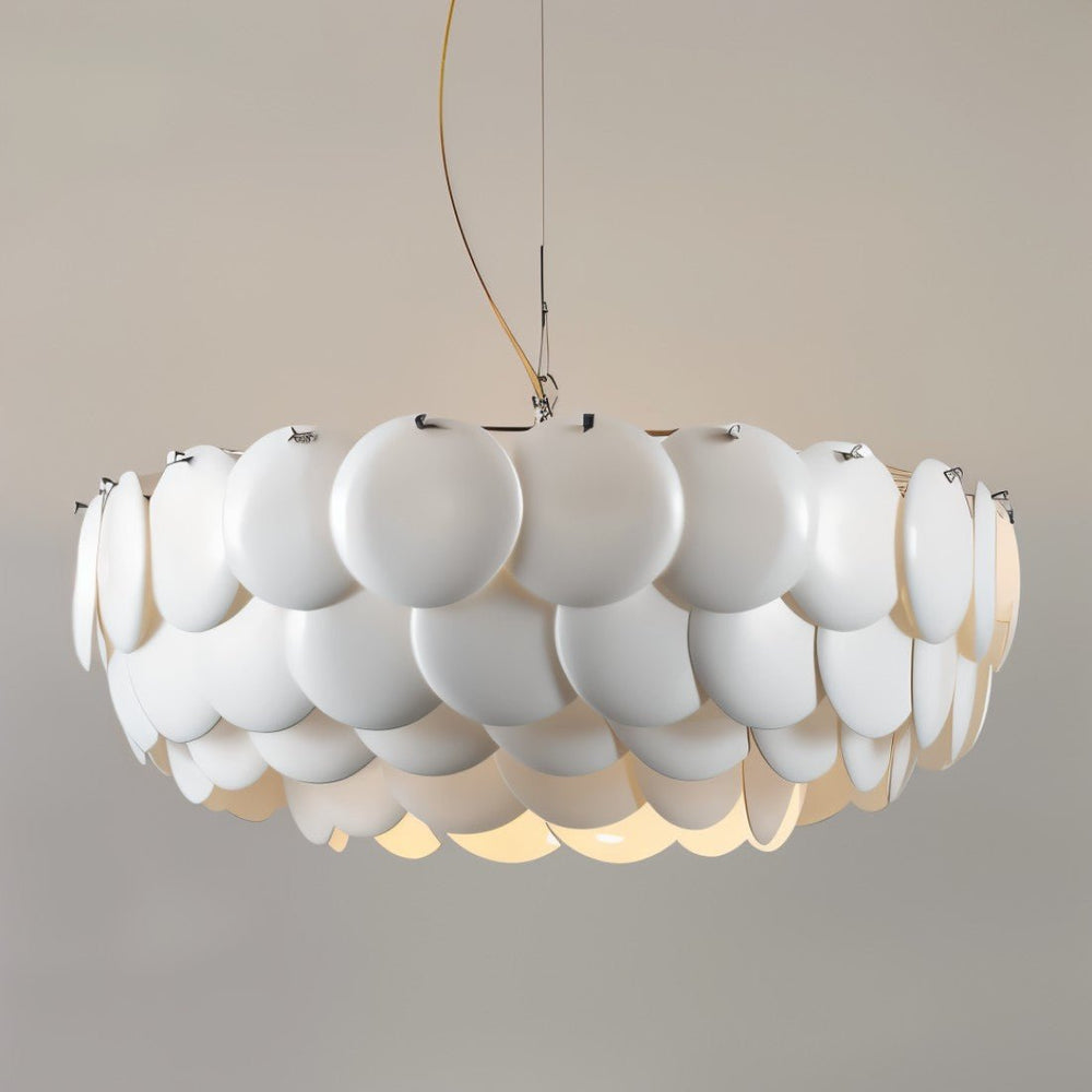 The Zahir Chandelier features a unique and sculptural design with cascading layers of overlapping ceramic discs. Crafted from iron and ceramic, this modern light fixture emits a warm and diffused glow. The Zahir Chandelier is ideal for modern dining rooms, living rooms, or entryways, creating a striking focal point and adding a touch of artistic flair to any space.