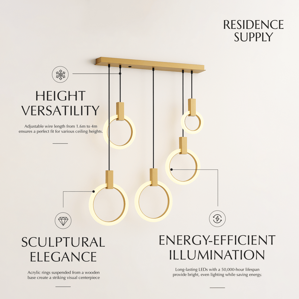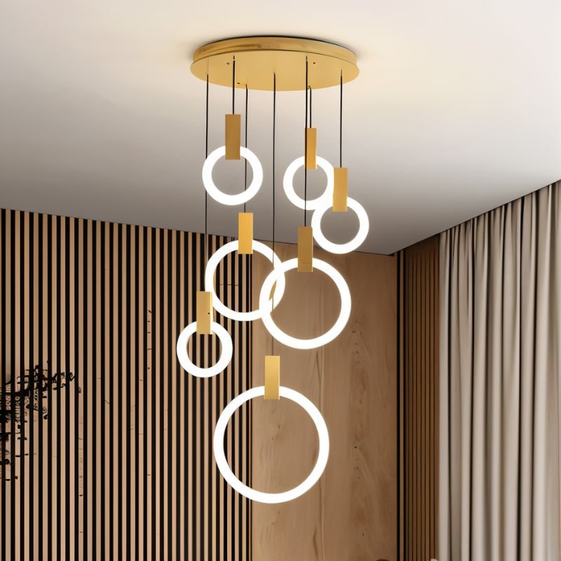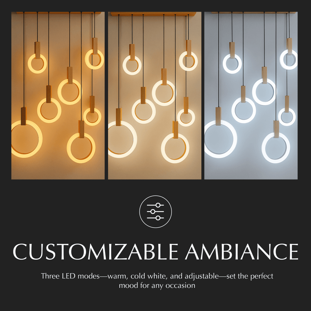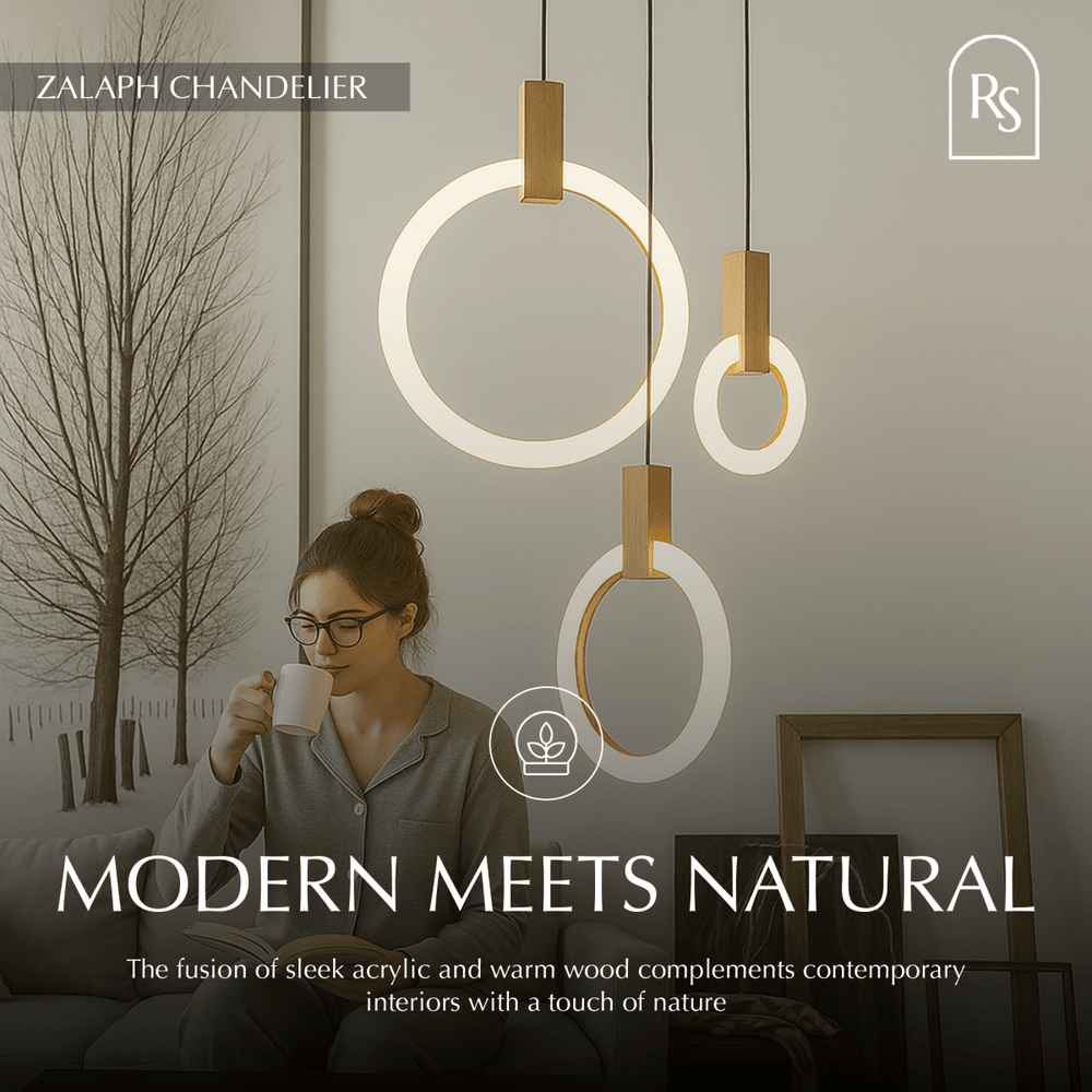 The Zalaph Chandelier is constructed using multiple acrylic ring heads suspended from a wooden base. This combination of materials ensures a modern and sophisticated aesthetic while providing durability and a unique charm to any room.
