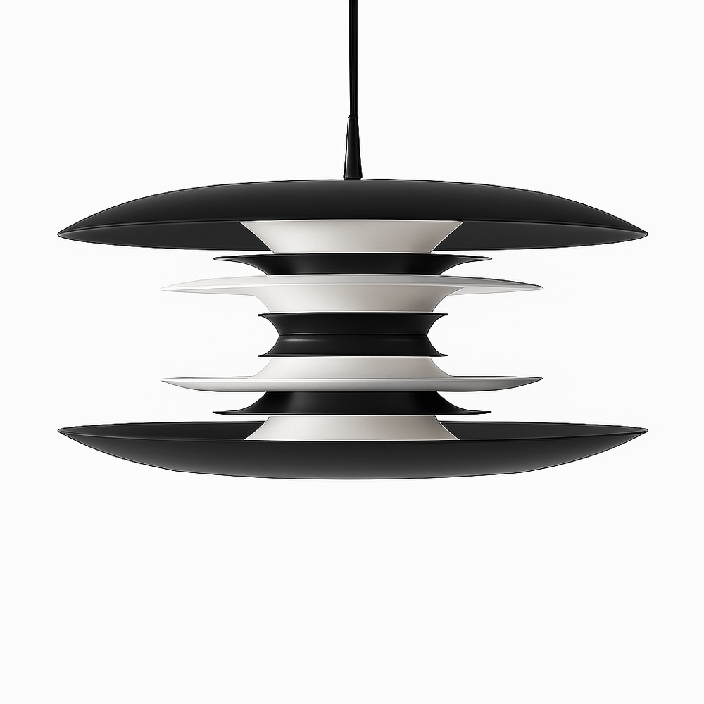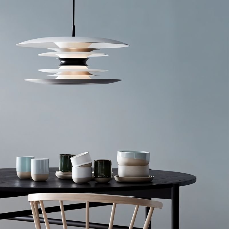 The Zentri Pendant Light is a modern aluminum and acrylic light fixture with a layered, disc-like design that diffuses light evenly. Its sculptural form creates a striking visual effect, making it ideal for dining areas, kitchens, or contemporary living spaces. The suspended structure balances function and aesthetics, offering ambient illumination with minimal glare. Available in four color combinations, it adapts seamlessly to different interiors.