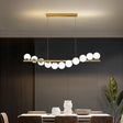 The Ariella Chandelier enhances the dining atmosphere by casting a radiant glow with its gold-finished iron frame and pearl-like glass lampshades, creating an elegant and sophisticated ambiance.
