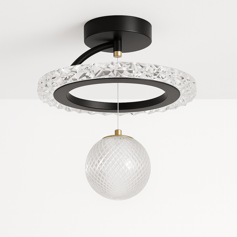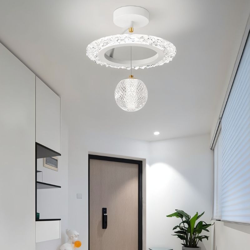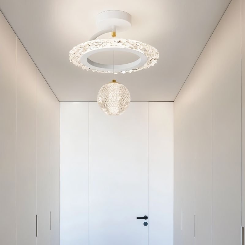 The Astorix Ceiling Light showcases a modern design with a circular iron frame and intricately textured acrylic elements, creating a striking visual balance. The light fixture features a suspended spherical centerpiece that enhances its geometric appeal. Perfect for hallways, foyers, or bedrooms, its versatile design fits various interior styles. Available in three colors and two sizes, this ceiling light offers options to complement diverse aesthetics. Its durable iron and acrylic construction ensures longevity while maintaining a sleek, contemporary look.