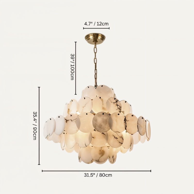 Weight: 29.7lbs (13.5kg) Material: Alabaster Marble, Metal Light Source: LED Light Bulb (replaceable) Bulb Included: Yes Number of Bulbs: 15 Bulb Base: E14 Dimmable: Upon Request Voltage: 90-260VAC Installation Type: Hardwired Chain/Cord Length: Up to 3.3ft (1 meter) Adjustable Cord: No Sloped Ceiling Compatible?: Yes Certifications: UL, CCC, CE, CQC, EMC, FCC, GS, LVD, PSE, ROHS, SAA, and VDE