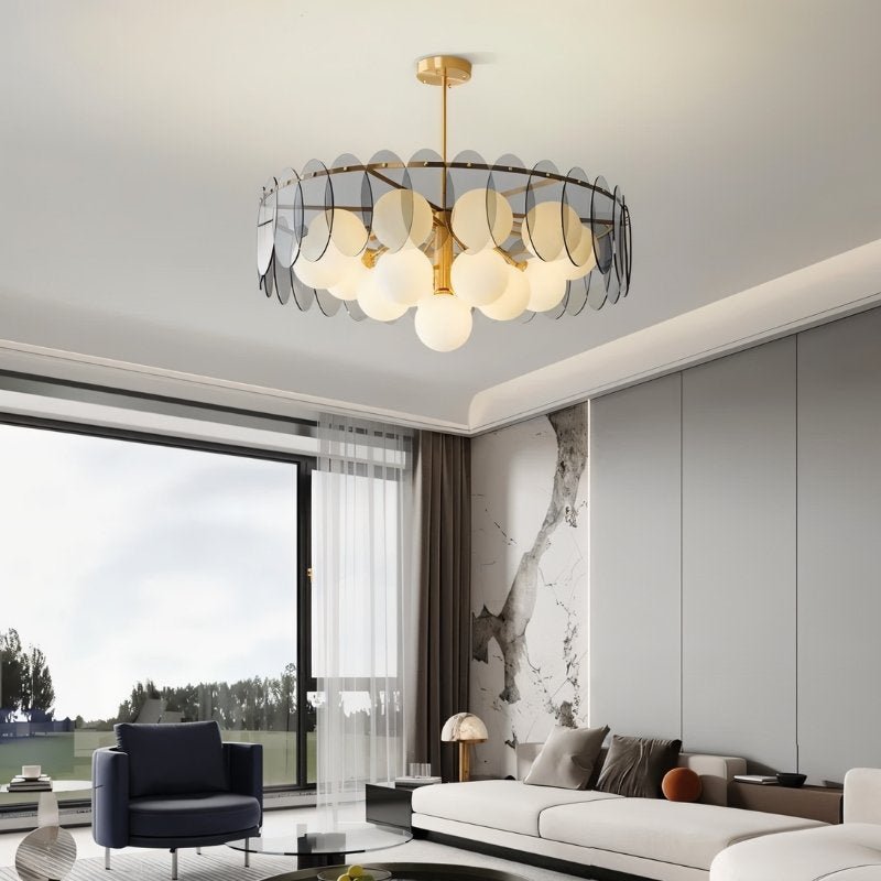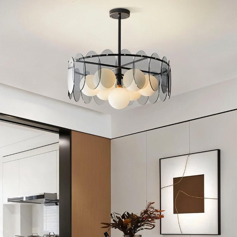 The Claribel Chandelier is a bold light fixture crafted from copper and glass, featuring a striking arrangement of frosted glass globes surrounded by a sleek black metal frame with suspended mirrored discs. The layered design enhances light diffusion, creating a dynamic interplay of illumination and reflection. Ideal for modern dining rooms, living spaces, and entryways, this chandelier brings depth and dimension to contemporary interiors while serving as a functional centerpiece.