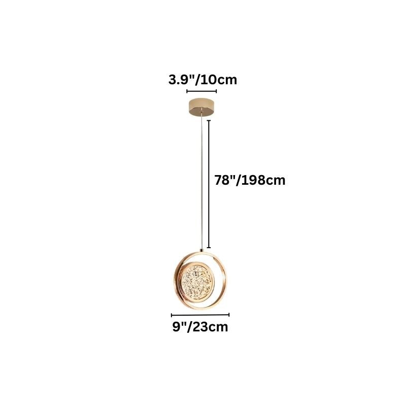 The Cornix Pendant Light is a modern light fixture featuring a sleek acrylic and metal construction. Its unique circular design with an illuminated crystal-like center creates a striking focal point. This pendant light is available in two styles and is perfect for bedrooms, living rooms, or dining areas. The suspended structure enhances ambient lighting while adding a sophisticated touch. Ideal for contemporary interiors, it combines elegance with functionality.