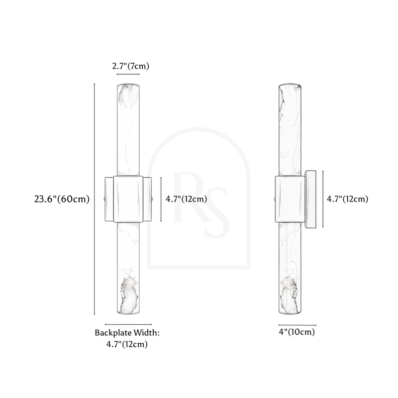 Product Dimensions: D4.7"(12cm) x H23.6"(60cm) Wattage (Lumens): 6W (600lm) Weight: 800g Material: Alabaster Marble, Copper Finish: Brass, Black, Nickel Light Source: LED Light Bulb (replaceable) Bulb Included: Yes Number of Bulbs: 2 Bulb Base: E26 Dimmable: No Voltage: 90-260VAC Installation Type: Wall Mount Canopy/Backplate Dimensions: H4.9"(12.4cm) Certifications: UL, CCC, CE, CQC, EMC, FCC, GS, LVD, PSE, ROHS, SAA, VDE
