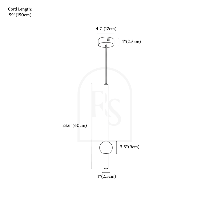 Product Dimensions: D3.5"(9cm) x H23.6"(60cm) Wattage (Lumens): 20W (2200lm) Material: Acrylic, Aluminum Finish: Black, White Light Source: Integrated LED Dimmable: Upon Request Voltage: 90-260VAC Installation Type: Hardwired Chain/Cord Length: Up to 4.9ft (1.5 meter) Adjustable Cord: Yes Canopy/Backplate Dimensions: D4.7"(12cm) x H1"(2.5cm) Sloped Ceiling Compatible?: Yes Certifications: UL, CCC, CE, CQC, EMC, FCC, GS, LVD, PSE, ROHS, SAA, and VDE