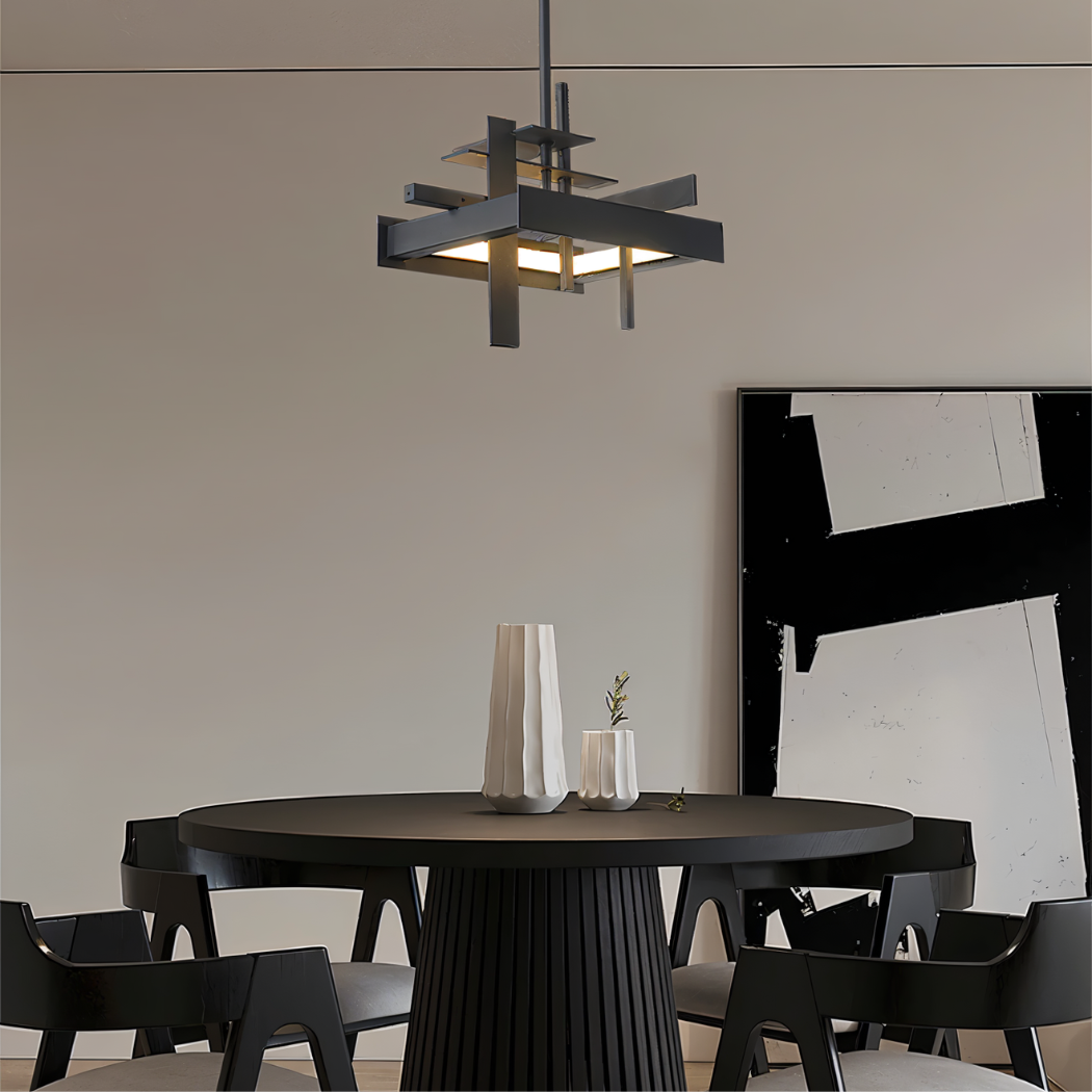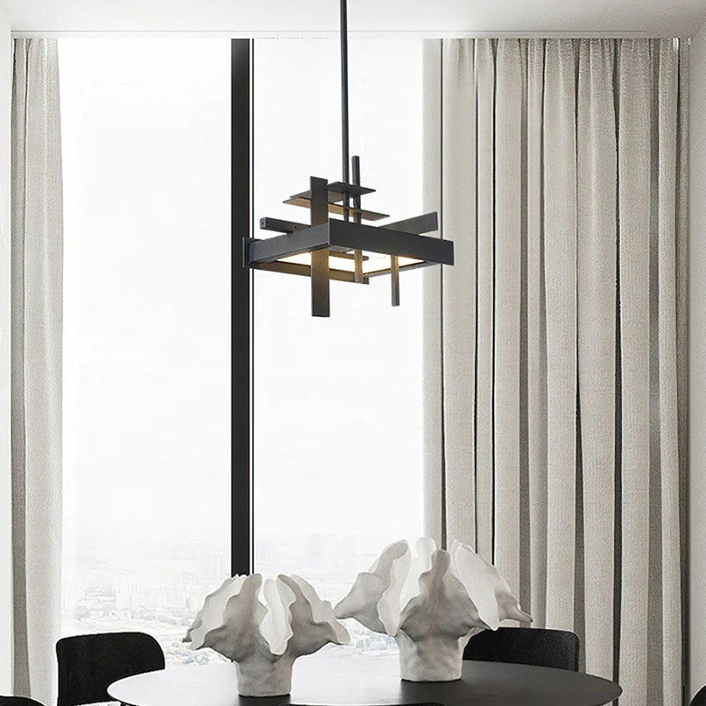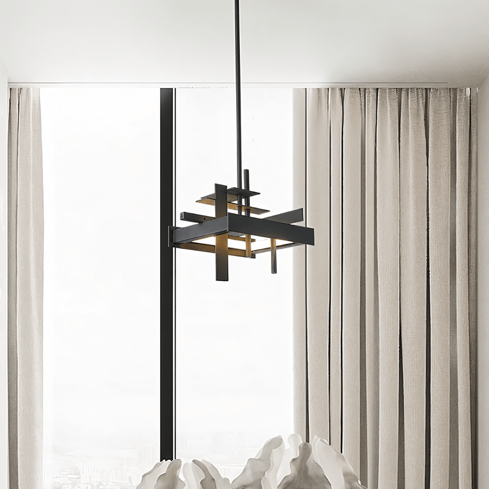 It features a geometric architectural design with intersecting bars, creating a balanced sculptural ceiling piece that doubles as functional art.