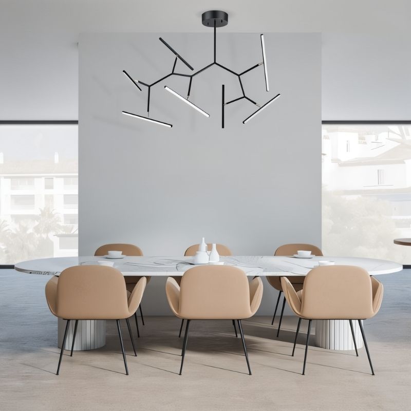 The Elyon Ceiling Light is a modern light fixture with a geometric, interconnected design crafted from durable aluminum and silicon. Its linear structure emits a soft, even glow, making it ideal for dining rooms, living spaces, or minimalist offices. Combining functionality with elegance, this fixture serves as both lighting and a statement piece. Its sleek black finish seamlessly complements contemporary interior styles.
