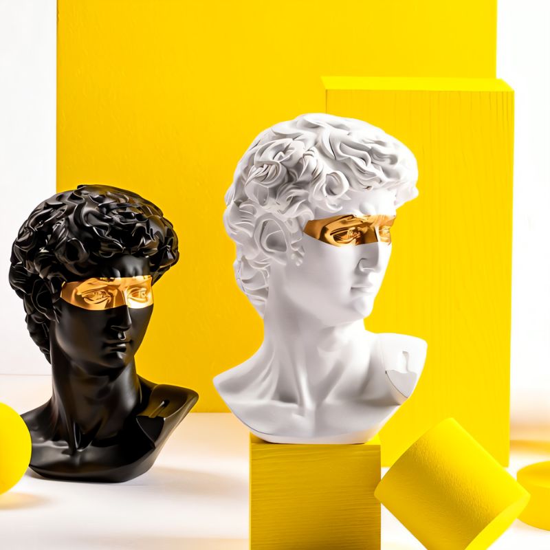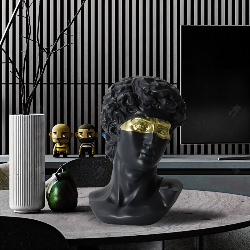 The Masked David Figurine stands out with its Renaissance-inspired design featuring a modern gold touch across the eyes, crafted from high-quality, eco-friendly resin. Available in black or white, it enhances any decor, from living rooms to offices, and is painted with non-toxic paints. Its versatility, durability, and aesthetic appeal make it a perfect gift and a unique addition to any home or office setting.