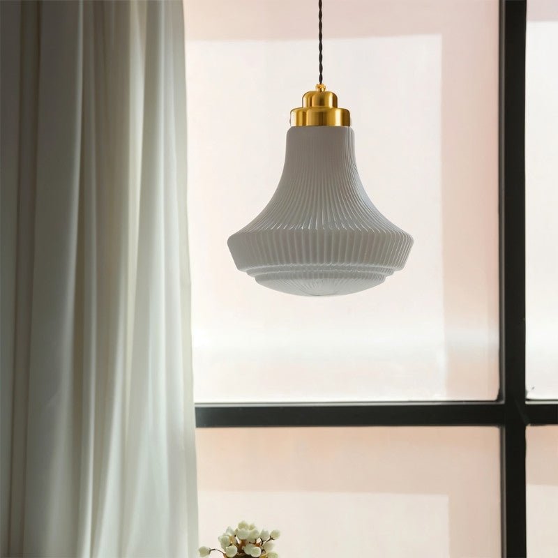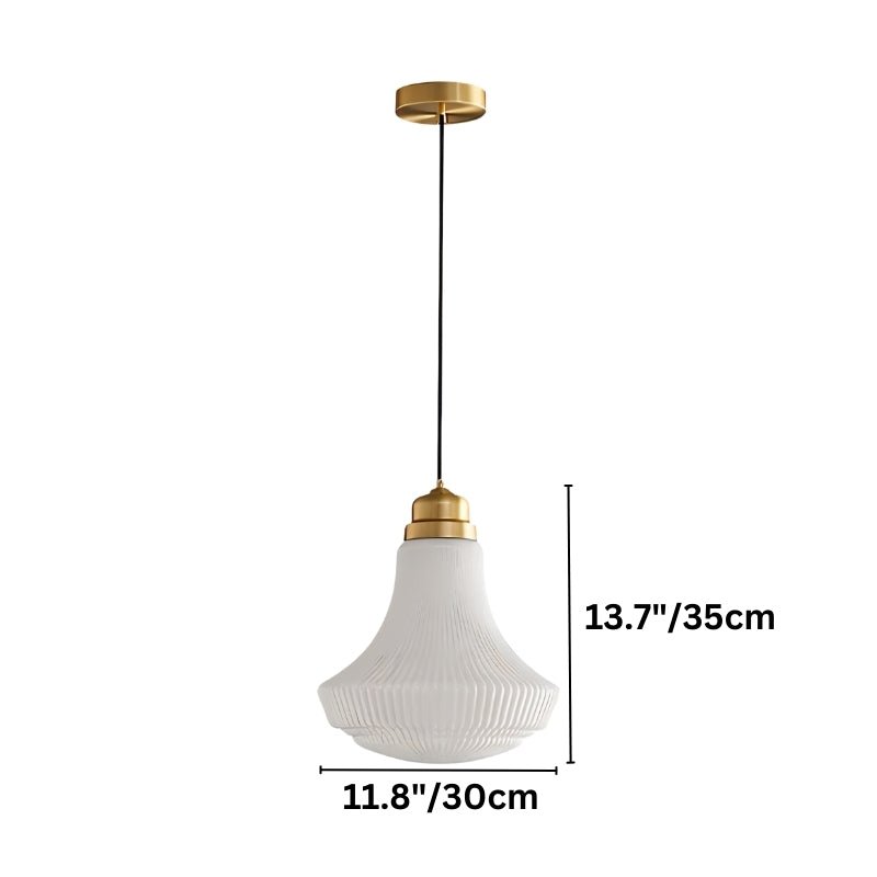 The Estero retro pendant light fixture blends brass or iron with delicately striped glass, bringing vintage-inspired charm to any room. Its classic, bell-shaped shade softens the glow for a warm, inviting ambiance, ideal for adding character to kitchens, dining rooms, or entryways. The striped glass texture enhances the light fixture's design, offering a unique play of light and shadow.