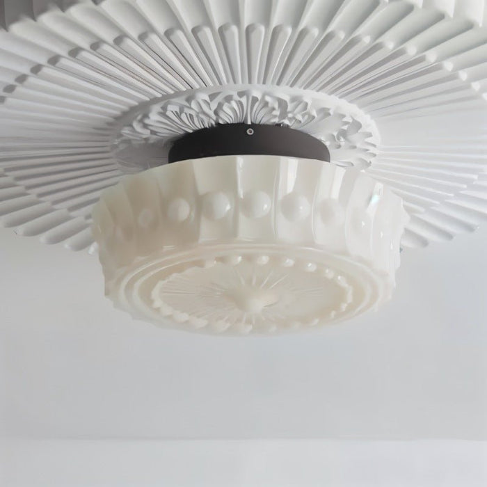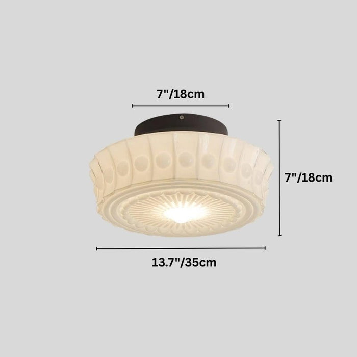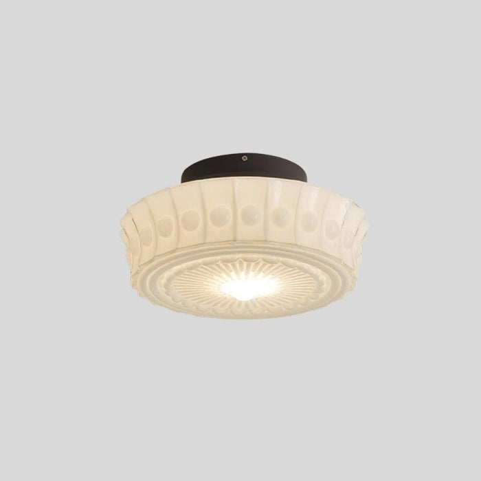 The Falow ceiling light fixture blends vintage aesthetics with modern durability, crafted from iron and glass for a timeless appeal. Featuring an intricately embossed glass shade with a radial sunburst pattern and decorative beaded trim, this fixture adds elegance to any interior. The flush-mount design makes it ideal for low ceilings, enhancing bedrooms, hallways, and living spaces with soft, ambient lighting. The iron base ensures stability, while the frosted glass diffuses light evenly, creating a warm, inviting atmosphere.