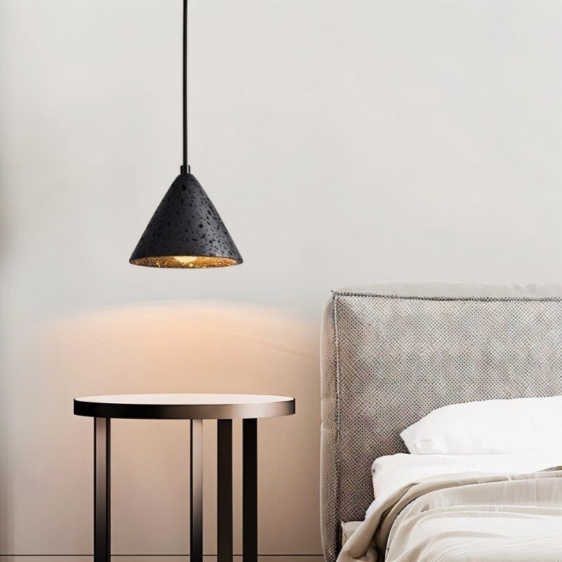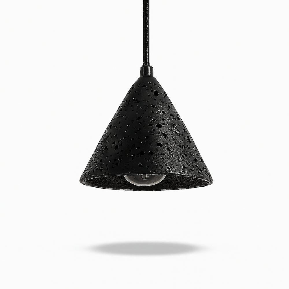 The Frene Pendant Light combines two unique light fixture designs crafted from black travertine. One features a rounded dome shape, perfect for adding elegance to modern and industrial interiors like dining rooms and kitchens. The other has a sleek, conical form, adding a minimalist edge ideal for bars, cafes, or hallways. Both styles highlight the natural texture of the travertine and emit a warm, ambient glow, enhancing their aesthetic appeal while providing functional lighting.