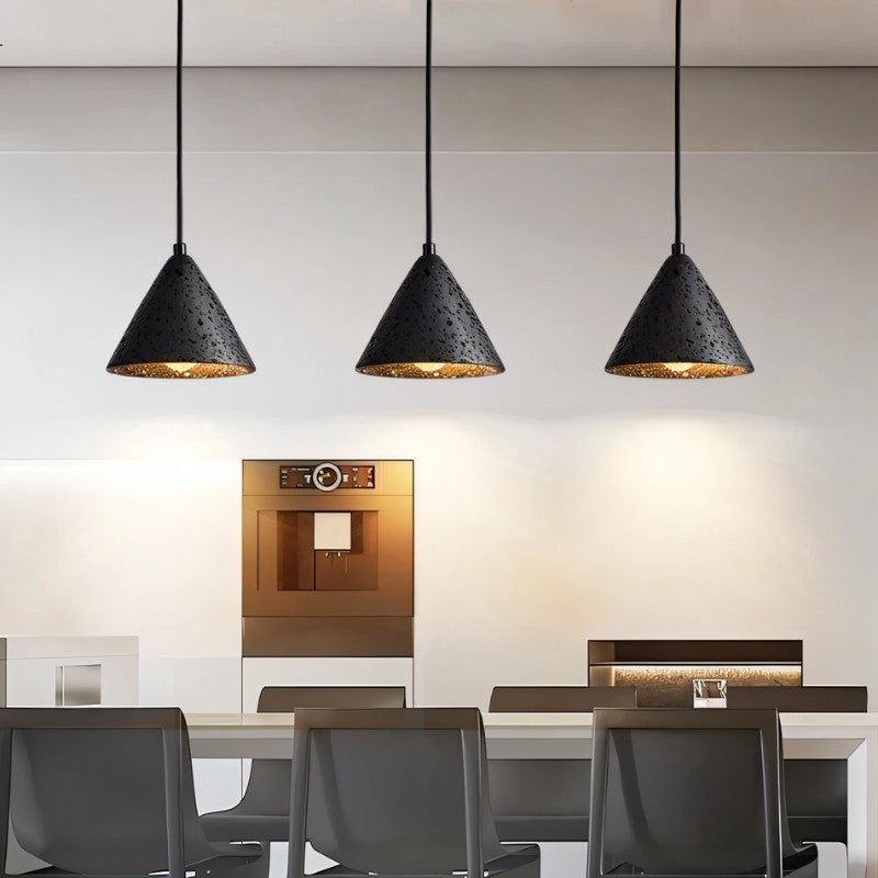 Textured black travertine pendant provides warm, ambient lighting and a striking design — perfect for enhancing modern dining rooms, kitchens, or cozy cafes.