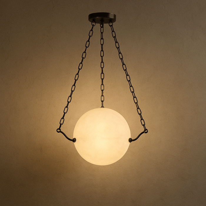 The alabaster ball design of the Globus Alabaster Pendant Light enhances the room's ambiance by emitting a soft, warm glow when lit. This gentle illumination creates a serene and calming atmosphere, adding a touch of sophistication and elegance to any space. The intricately crafted alabaster balls not only provide a captivating visual appeal but also blend seamlessly with the durable metal frame, ensuring both aesthetic charm and durability. This combination of materials and design details makes the pendant light a focal point that elevates the overall ambiance of the room.
