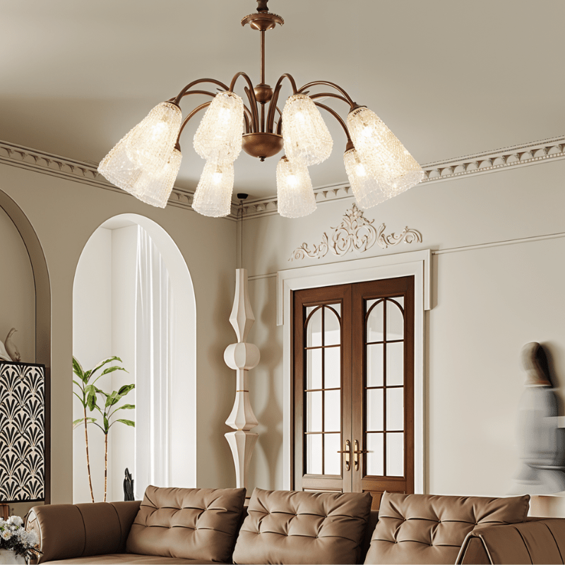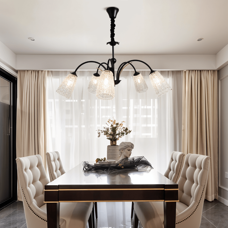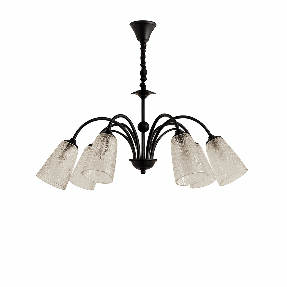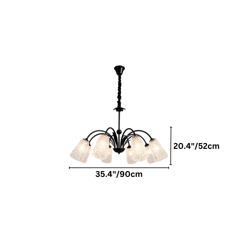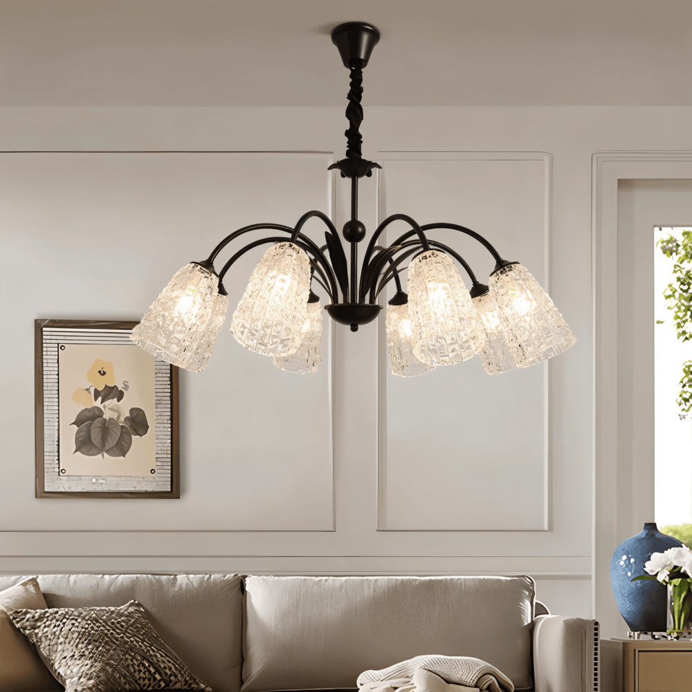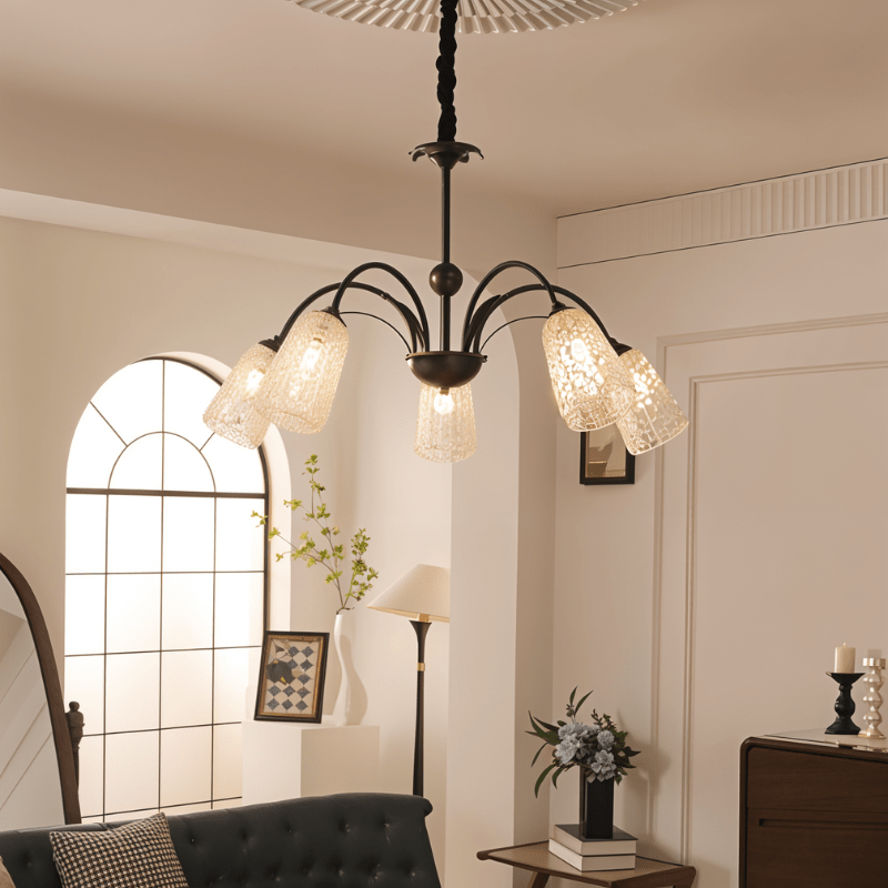 The Glovy Chandelier is crafted from durable iron paired with elegant, textured glass lampshades, creating a refined and sophisticated look.