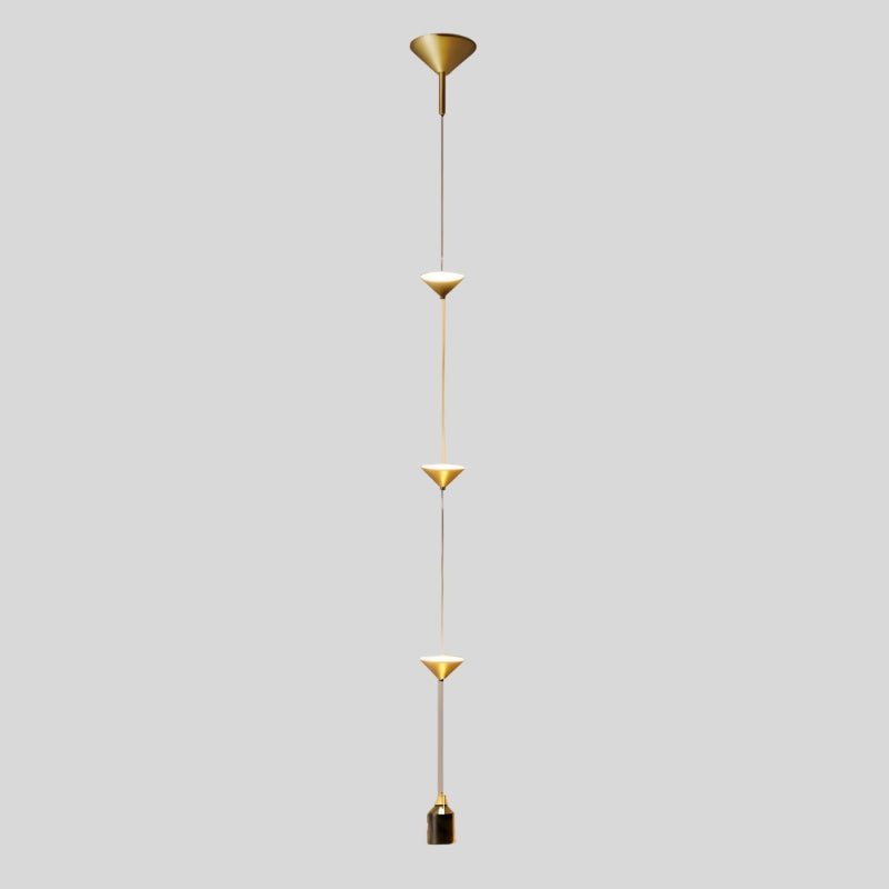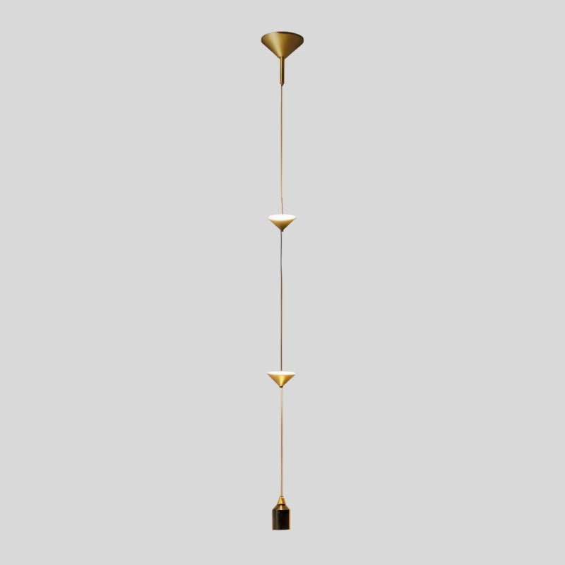 The Hadiya Pendant Light showcases a sleek vertical design with dual-cone metal elements and a weighted cylindrical base for balance. Emitting ambient illumination, this modern light fixture is ideal for bedside installations, reading nooks, or minimalist interiors. Its geometric form enhances contemporary spaces, offering both functional and decorative lighting. Crafted from metal and iron, it delivers a refined yet practical statement in any setting.