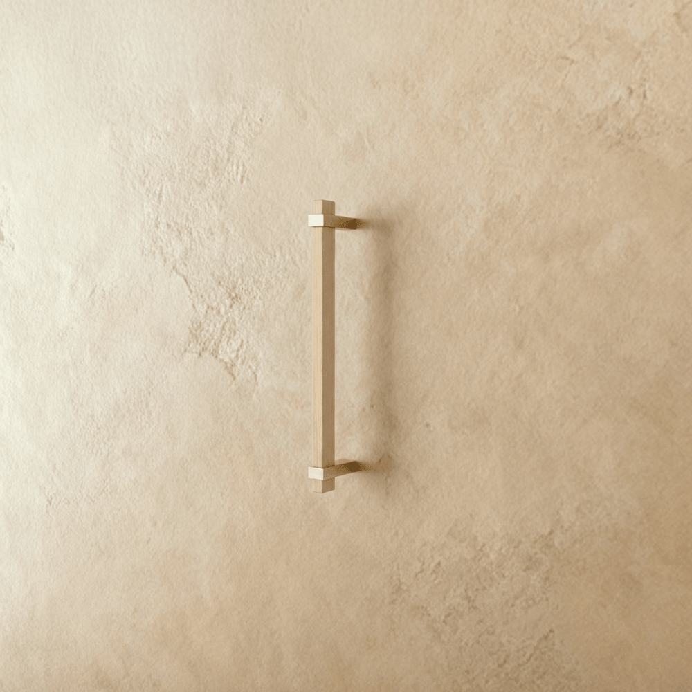 The Hazil Knob And Pull Bar combine a sleek wooden bar with golden metallic brackets for a refined, modern design. Its minimalist profile adds warmth and elegance, making it ideal for cabinets, drawers, and wardrobes in contemporary or rustic interiors.
