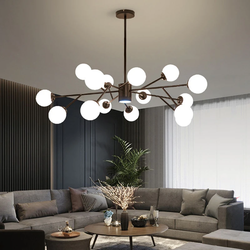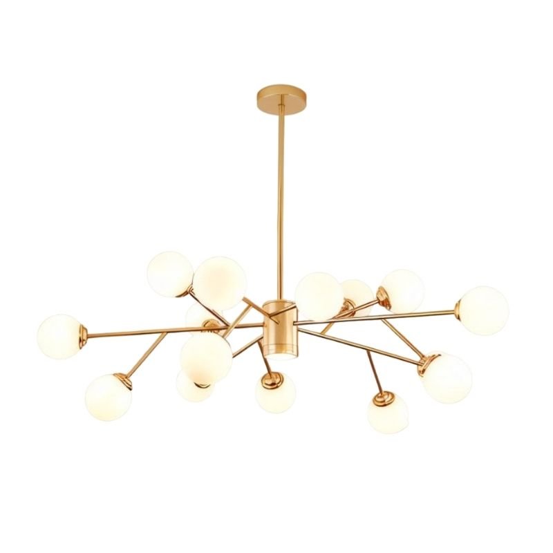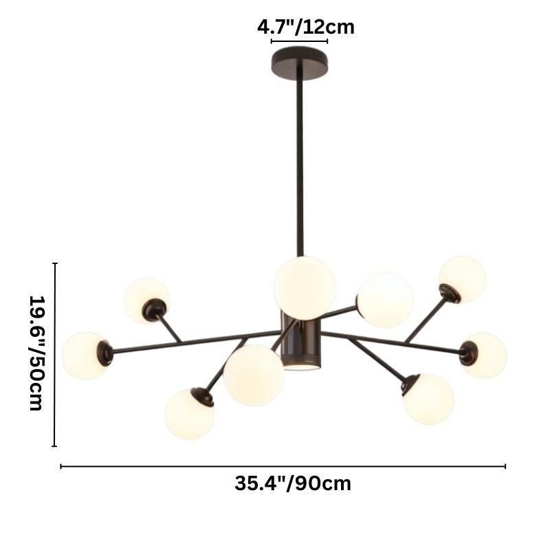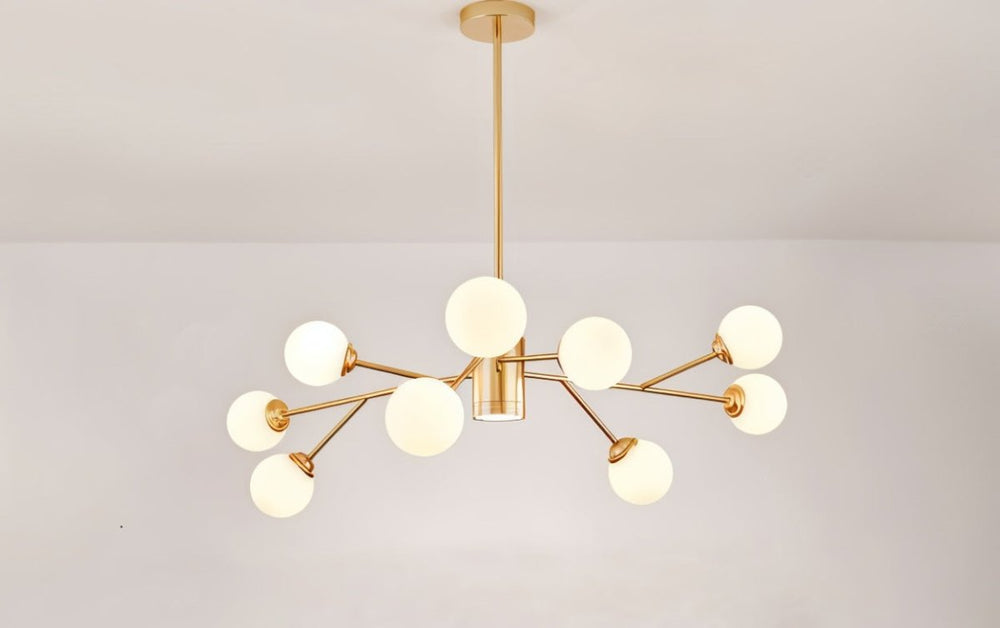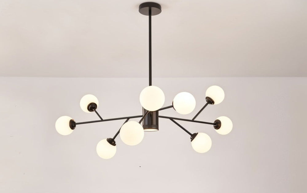 The chandelier's unique branching design and cluster of globes create a striking and modern aesthetic.