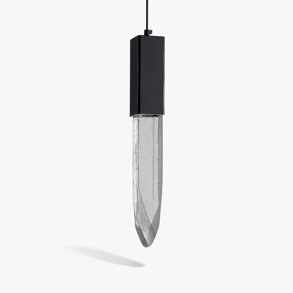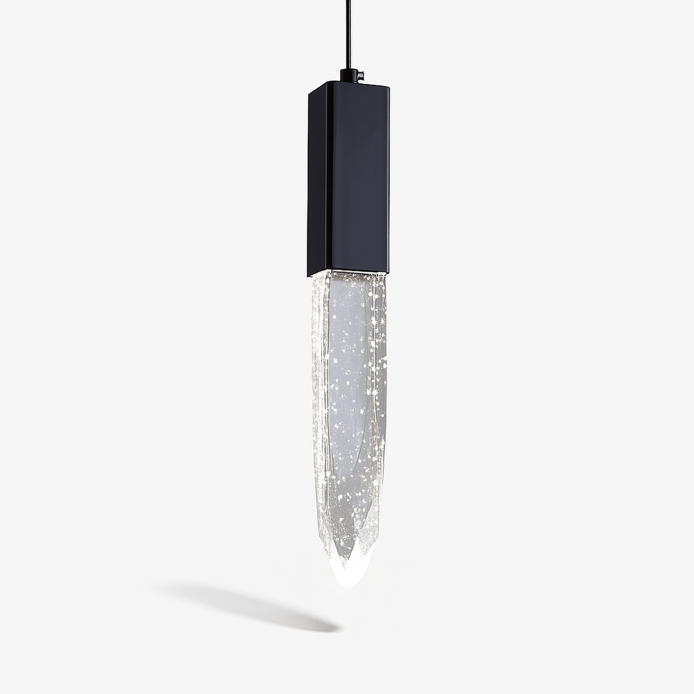 The Hiku pendant light is a sleek, modern light fixture crafted from metal and crystal. Its elongated crystal diffuser, embedded with shimmering details, creates a dazzling glow, enhancing ambiance with elegance. The minimalist metal frame provides a striking contrast, making it perfect for bedrooms, dining areas, or kitchen islands. Designed for contemporary interiors, this pendant light delivers both functional illumination and a refined aesthetic.