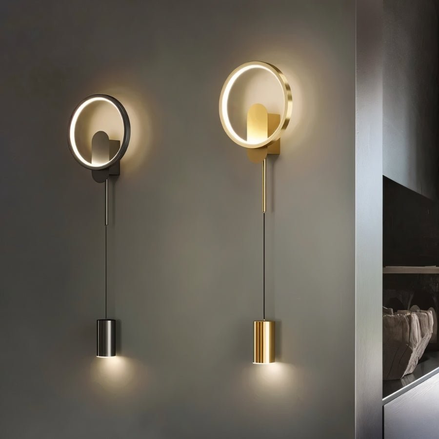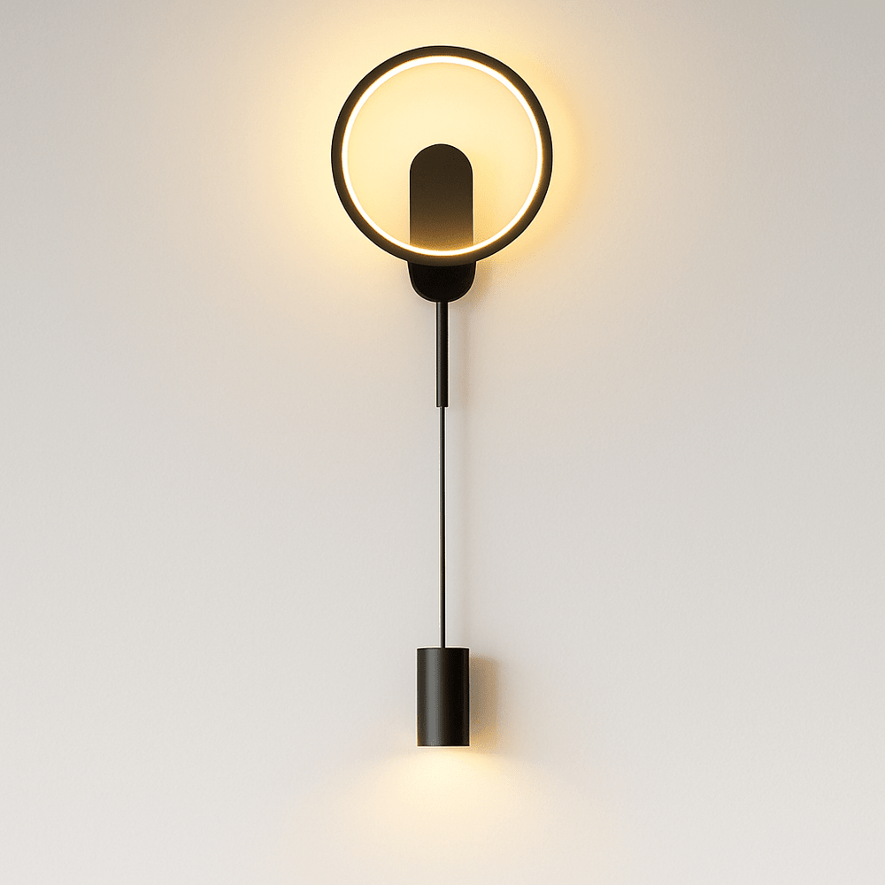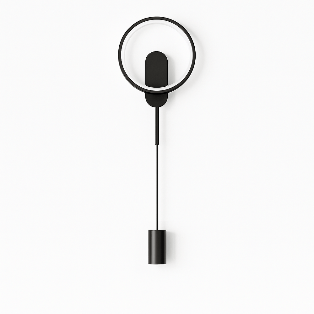 Imrat Wall Lamp is a sophisticated light fixture made from durable iron and acrylic. It features a circular frame with an acrylic diffuser for ambient lighting and an adjustable cylindrical light source for focused illumination. Available in black and gold finishes, its sleek design suits staircases, hallways, living rooms, and entryways, adding a contemporary touch to residential and commercial spaces.