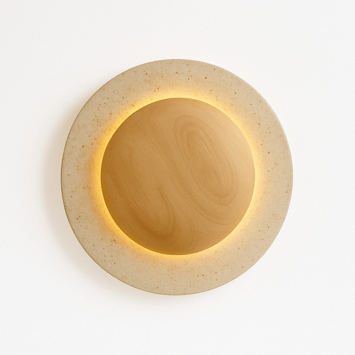 The Jenal Wall Lamp is a sculptural light fixture that combines organic travertine stone with modern lighting. It features a circular stone frame with a recessed wooden core, creating a striking contrast in texture and form. The soft perimeter glow provides warm, indirect illumination, enhancing ambiance without glare. Designed for contemporary interiors, it suits hallways, bedrooms, and lounge spaces in both residential and hospitality settings.