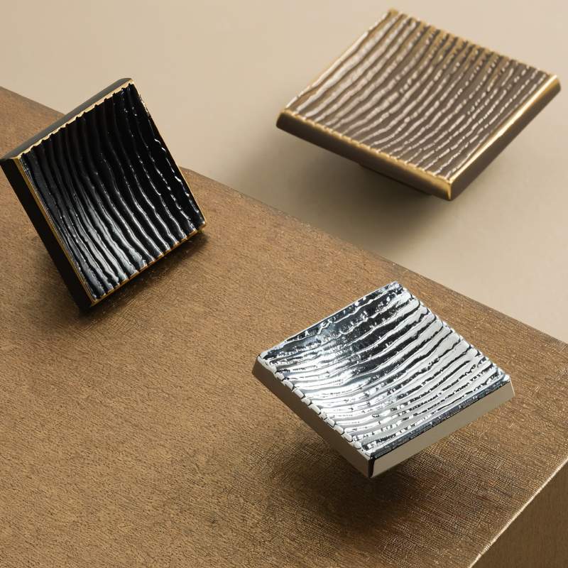 Ketine is a square brass cabinet handle with a textured surface, adding depth and dimension. Its ridged pattern creates a refined, tactile grip, enhancing modern and classic interiors. Designed for cabinets, drawers, and wardrobes, it offers a bold, elegant statement while ensuring durability.