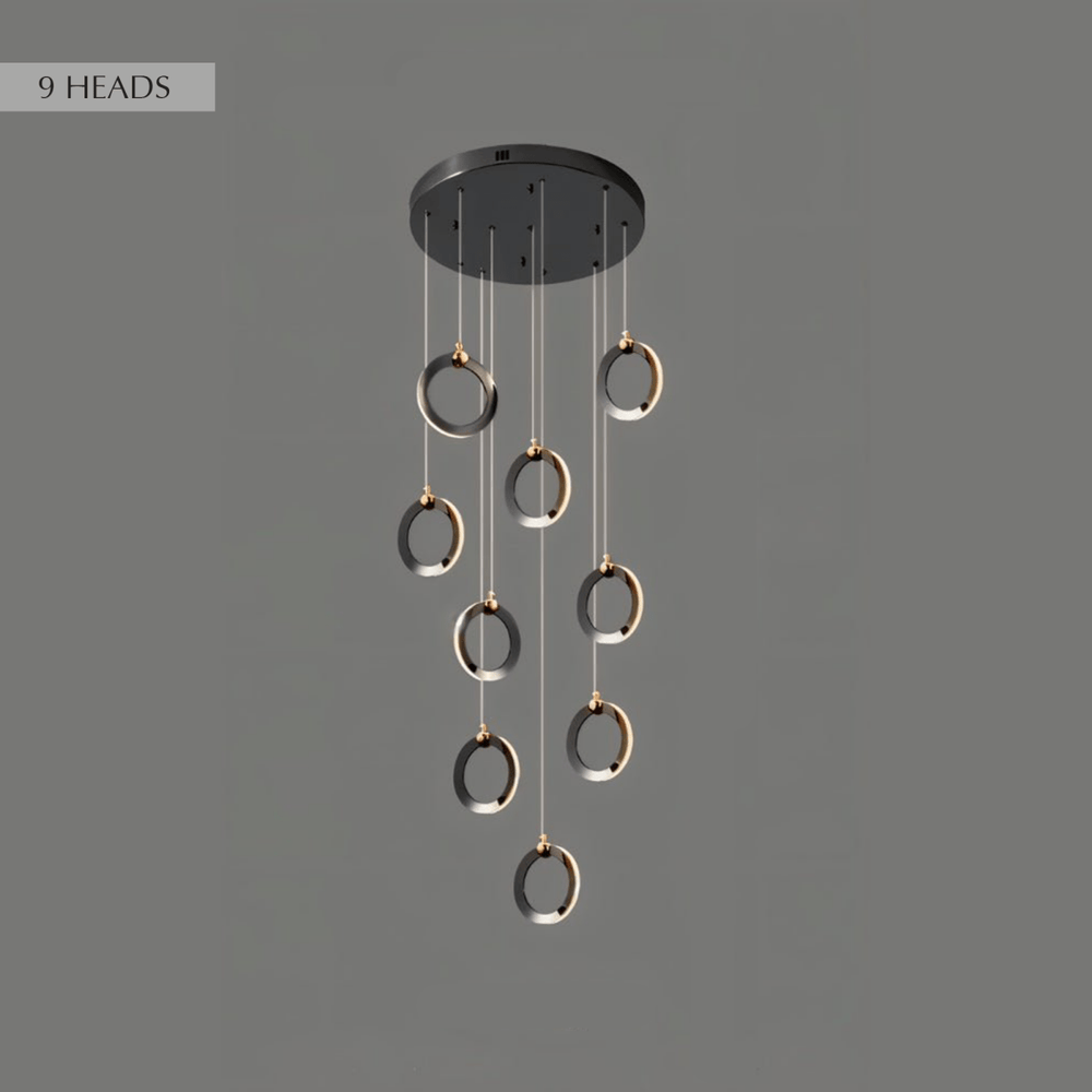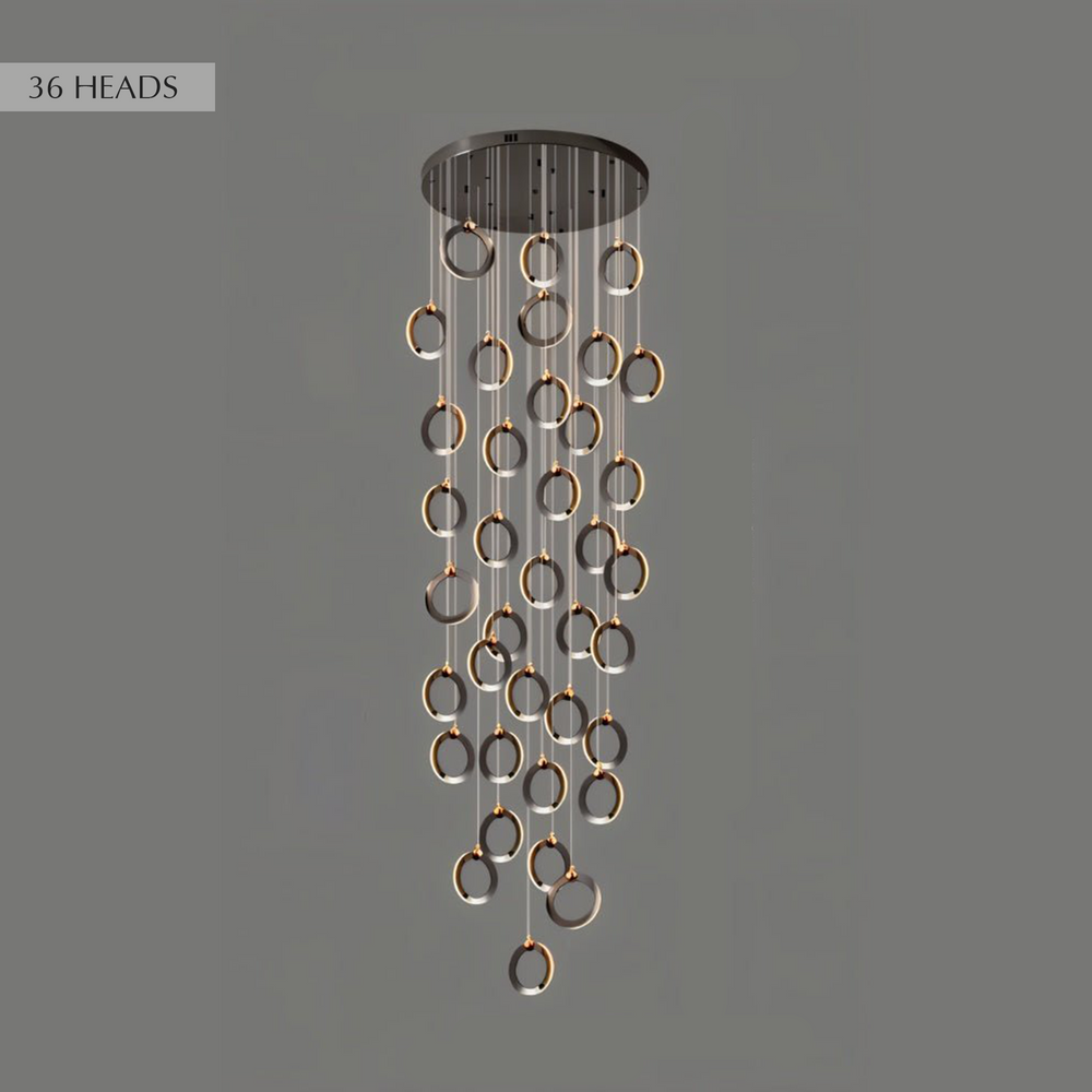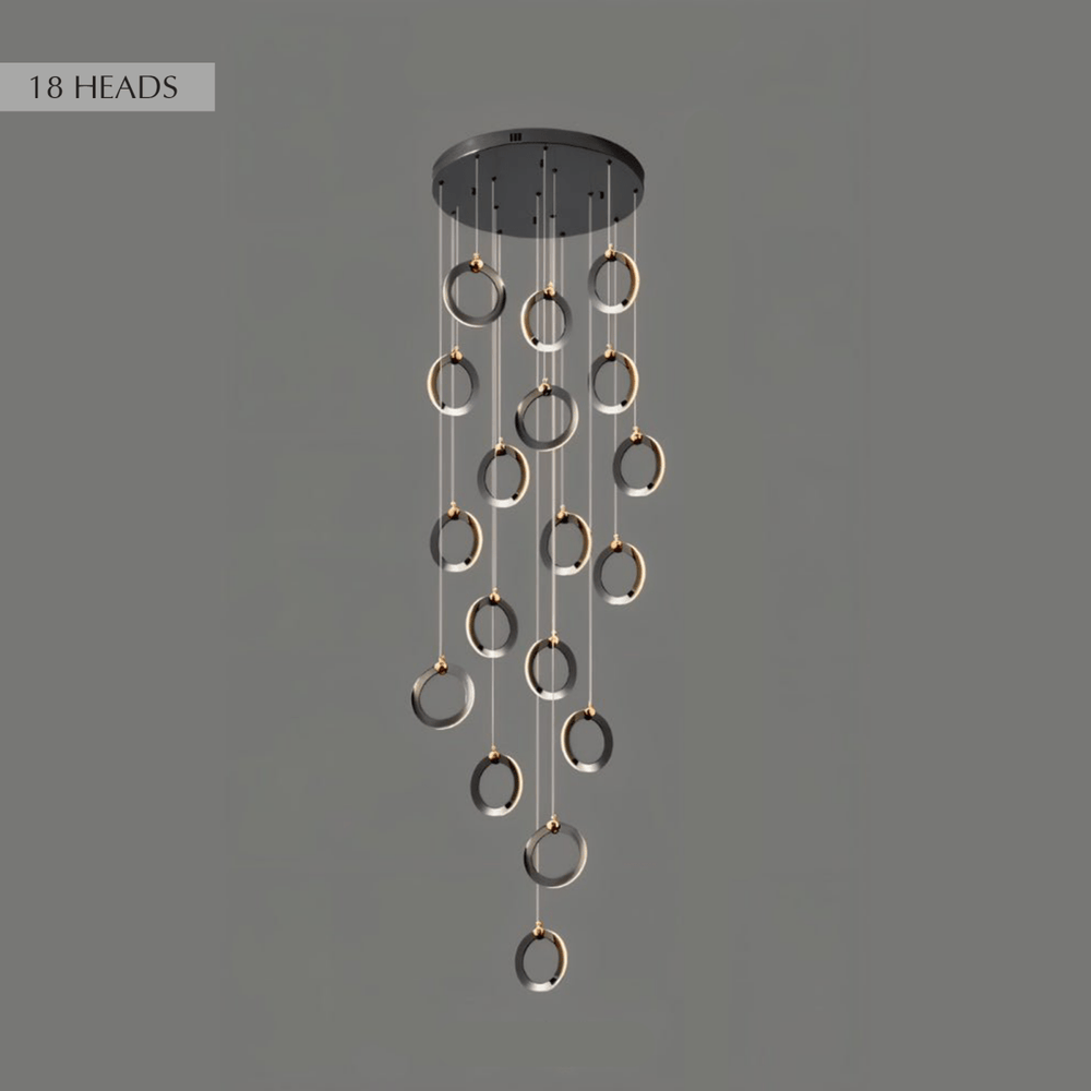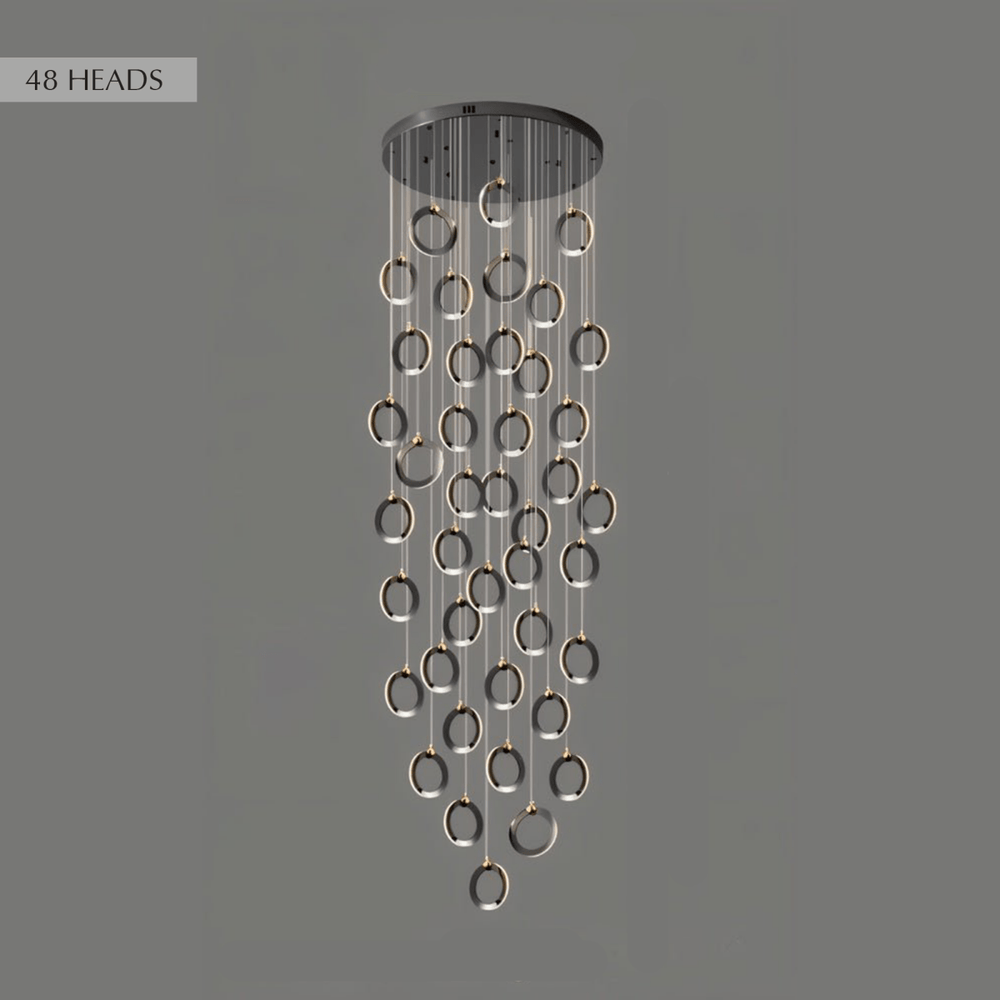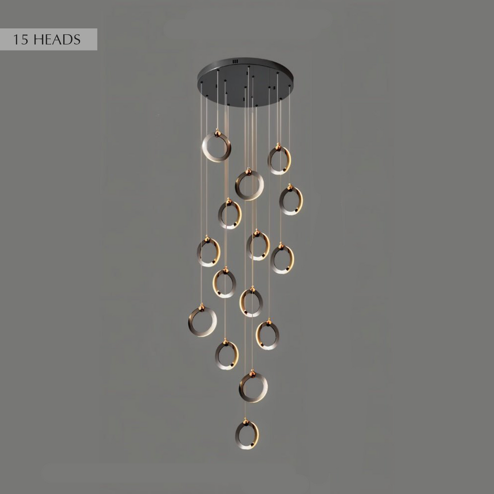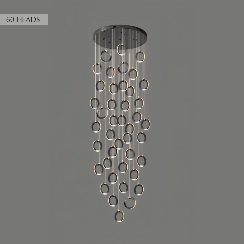 Cascading rings create a breathtaking focal point for staircases, adding modern flair and dramatic lighting.