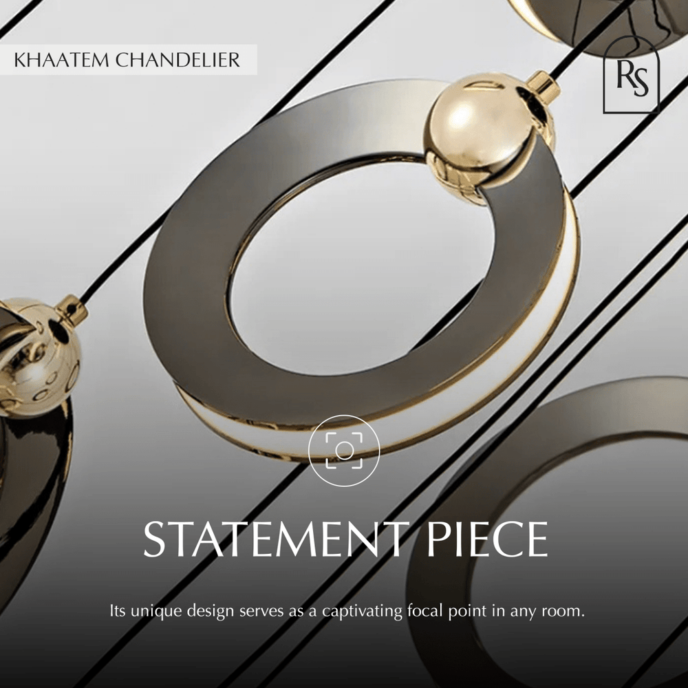 The Khaatem Chandelier is expertly crafted from high-quality metal rings adorned with seamlessly integrated LED Acrylic lights, ensuring a durable and stunning focal point for any room.