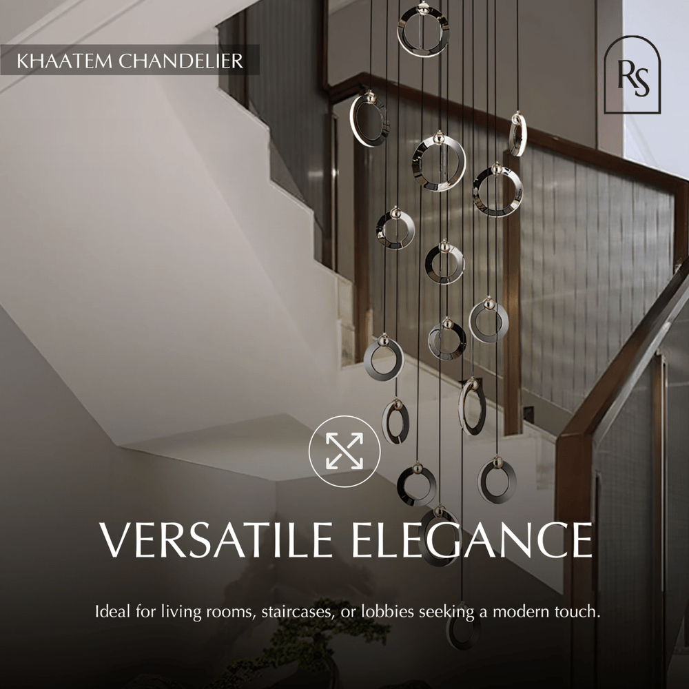 The Khaatem Chandelier combines simple style and futuristic design with its metal rings featuring integrated LED Acrylic lights, offering various ring quantities to suit your space. Casting an ethereal glow, this chandelier's captivating charm will leave your living room, staircase, or lobby aglow, enchanting all who enter. It's the ideal choice to accentuate your space with mesmerizing allure.