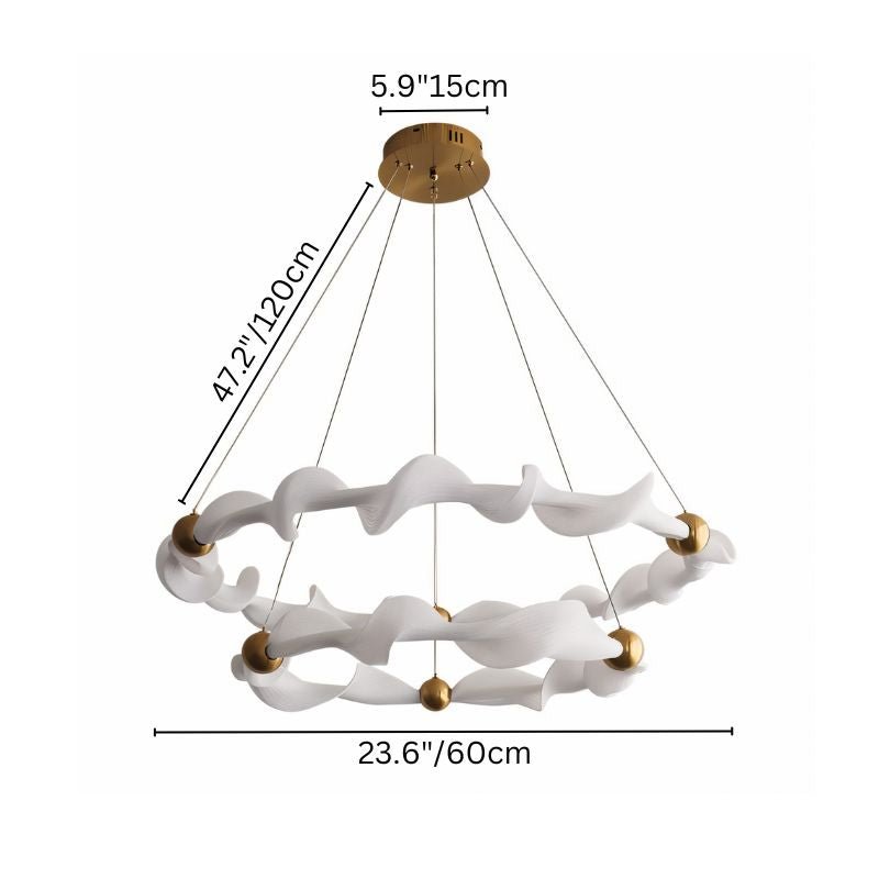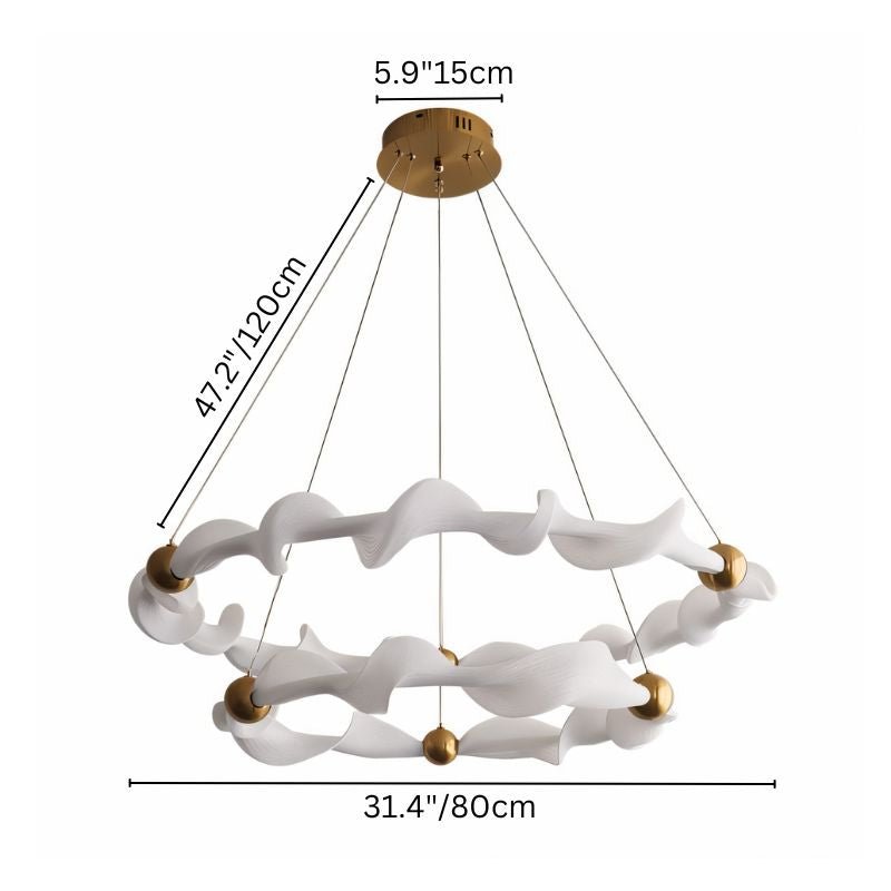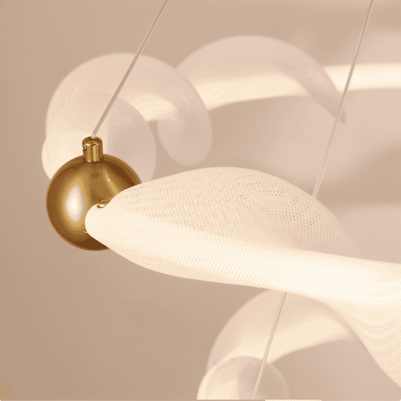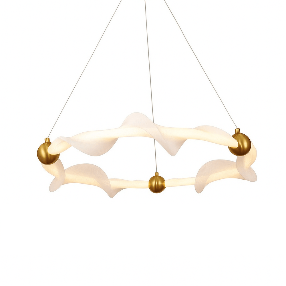 The Kyria Chandelier is a sculptural light fixture made from metal and fabric, featuring fluid, wave-like rings suspended by delicate cables. Gold-finished spheres accentuate its dynamic form, creating a striking focal point. Designed for dining rooms, living spaces, and high-ceilinged entryways, it diffuses light softly for an elegant glow. This statement piece enhances modern, minimalist, and artistic interiors in both residential and boutique commercial spaces.