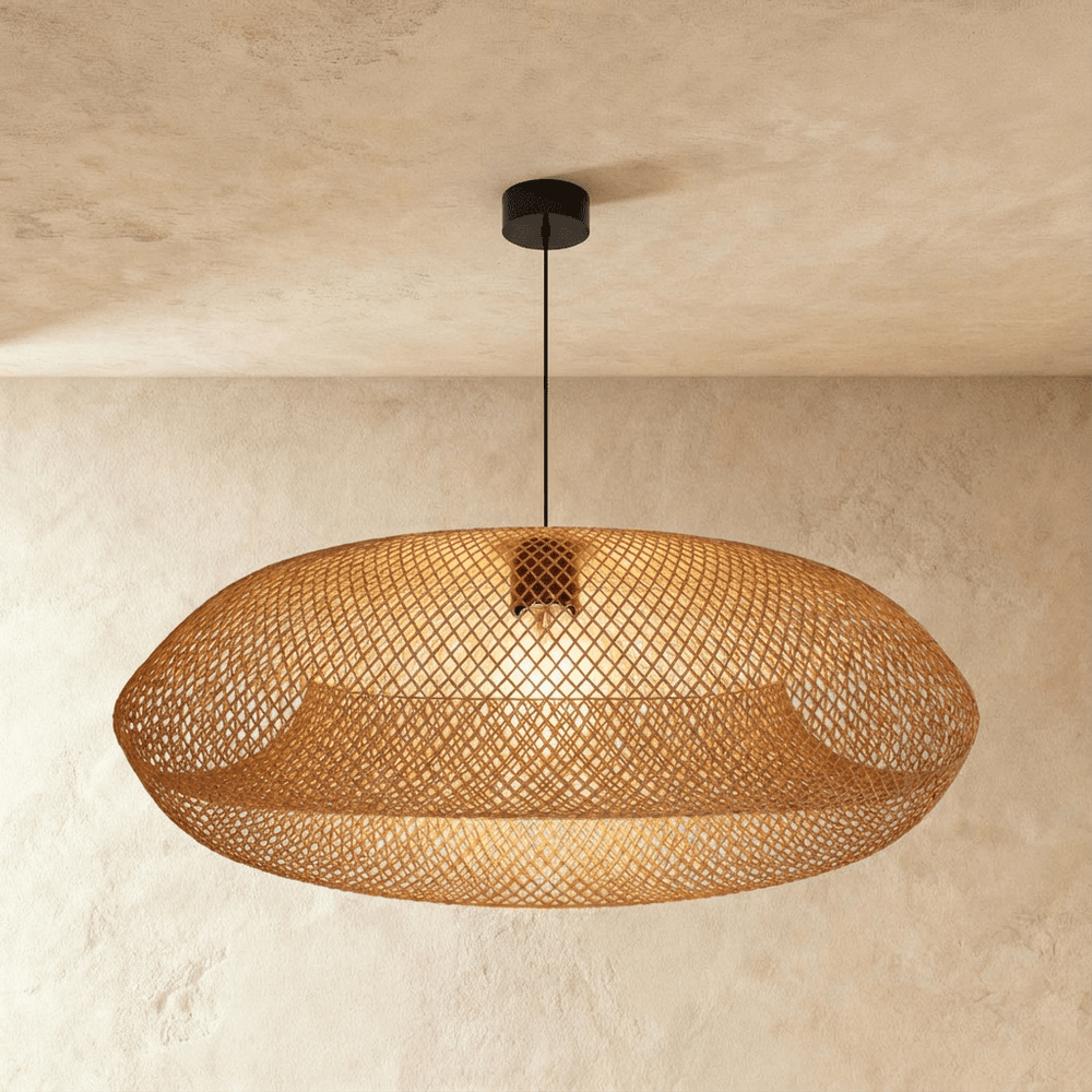 Braided rattan shade adds organic texture and a rustic charm to any space.