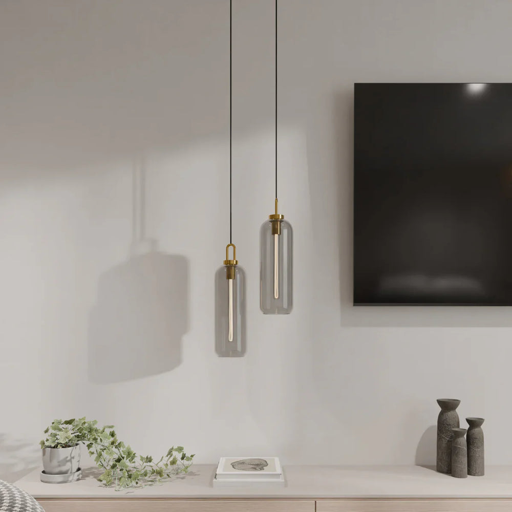 The Kanani Pendant Light offers both options: you can choose between a frosted gray or clear glass shade, each accented with golden brass details to suit your design preference.