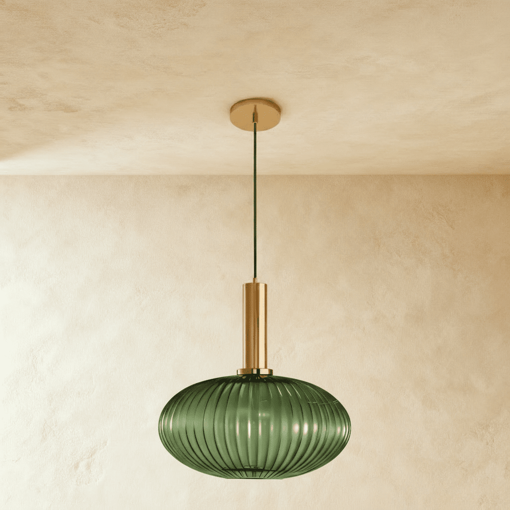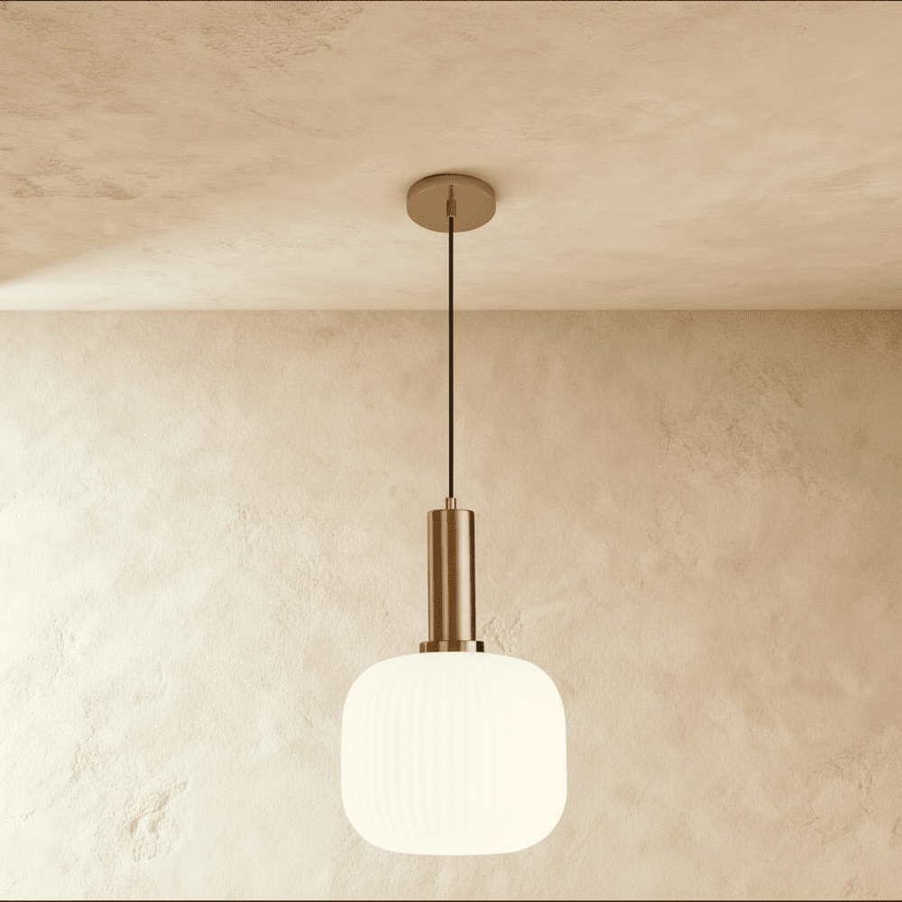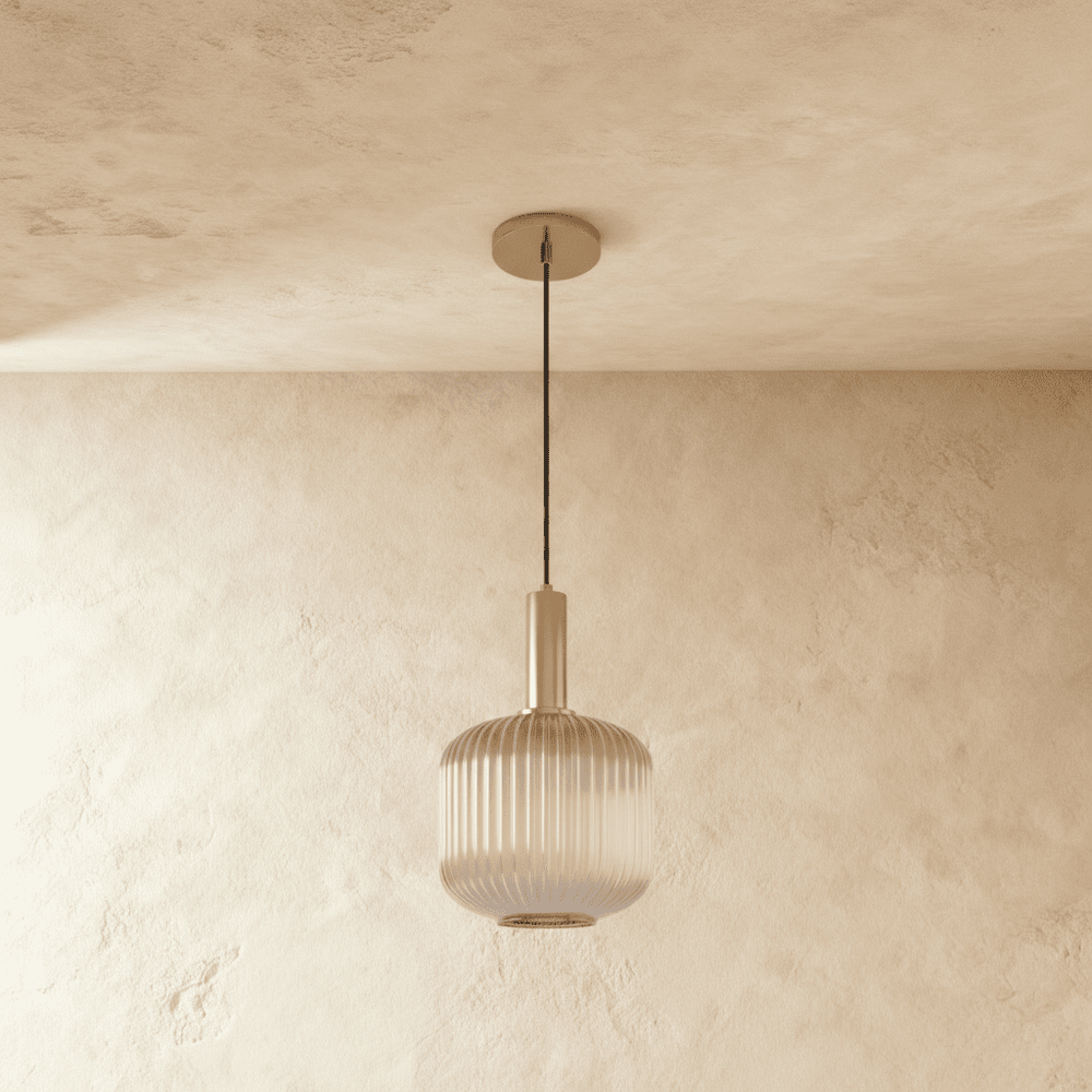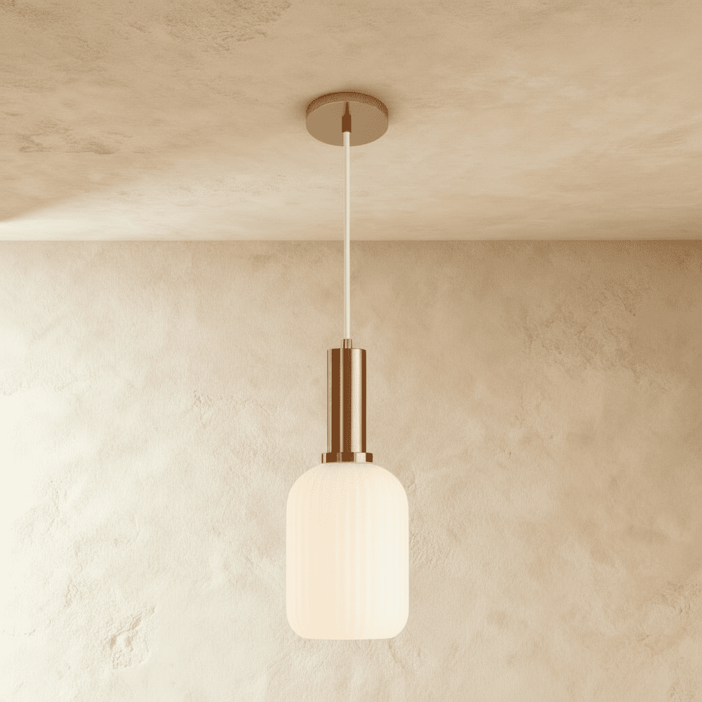 Fluted glass shade with gilded brass accent offers diffused illumination and vintage charm — perfect for dining rooms, kitchen islands, and entryways.
