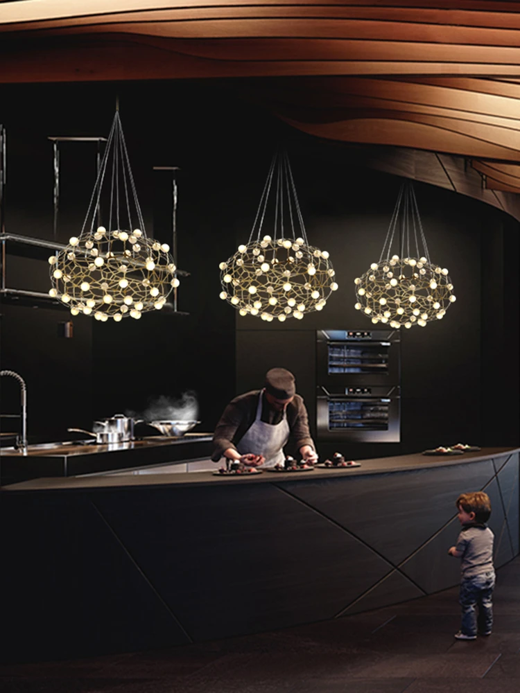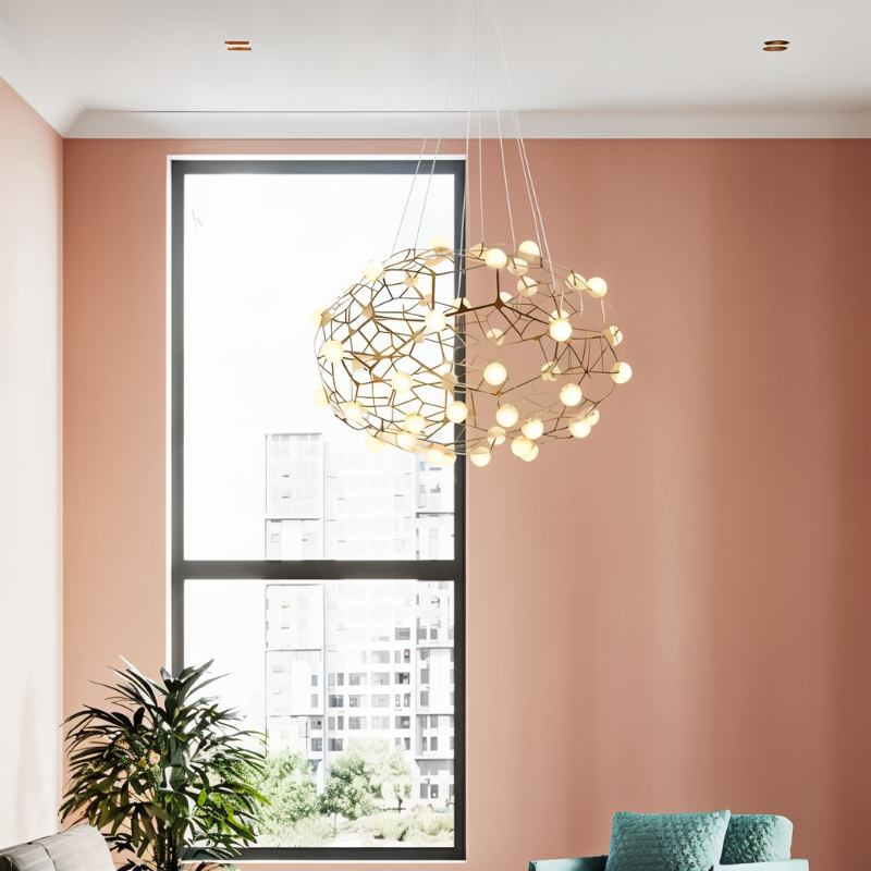 The Gypsophila Chandelier is constructed from superior quality stainless steel with a timeless gold-plated finish, and it features harmoniously arranged acrylic globes that emit a captivating luminous effect. This combination of materials ensures both durability and elegance, making it a standout piece for any interior design.