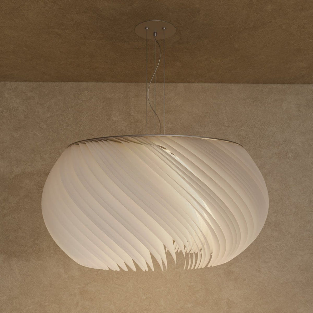 The Malakos Chandelier has a wavy white acrylic and parchment shade, adding modern sophistication.
