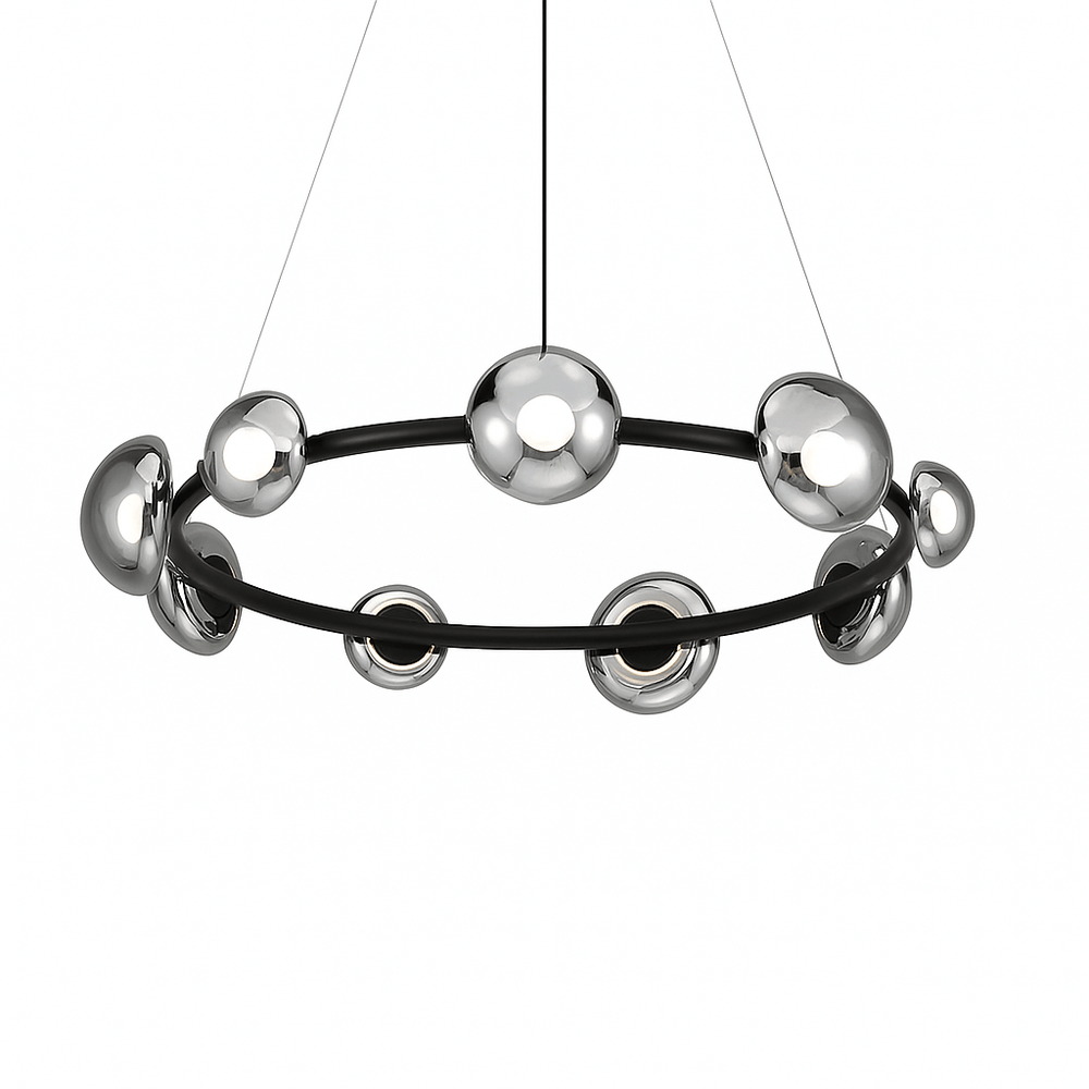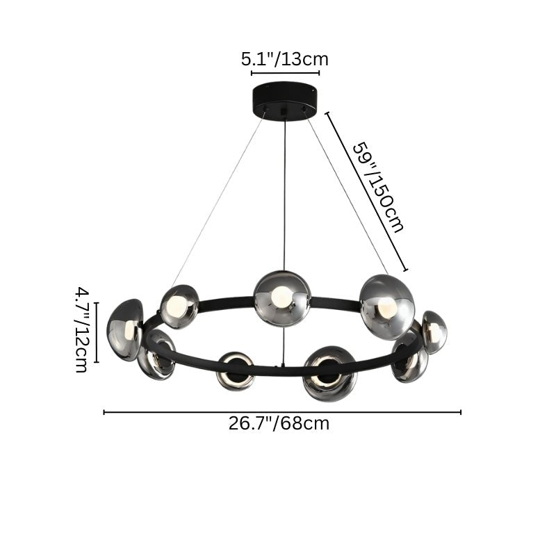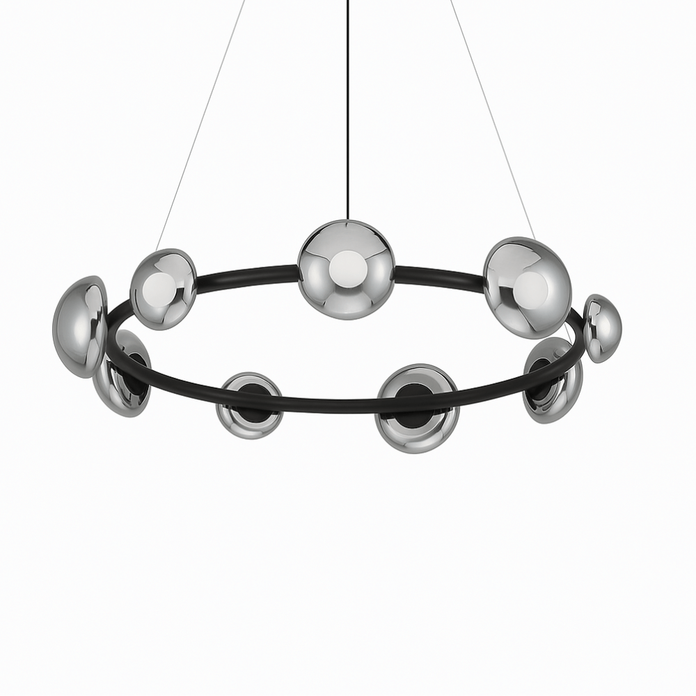 - The chandelier’s circular frame adds sophistication to contemporary interiors.