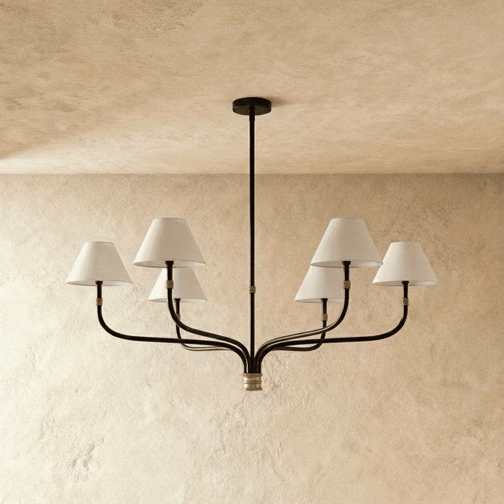 The Lita Chandelier Light features a sleek iron frame with gracefully curved arms accented by subtle gold details. Six cloth shades diffuse light evenly, creating a warm and inviting ambiance. Its balanced design suits dining rooms, living spaces, and high-ceiling foyers, seamlessly blending modern and traditional interiors. This light fixture provides ample illumination while maintaining an airy, sophisticated presence.