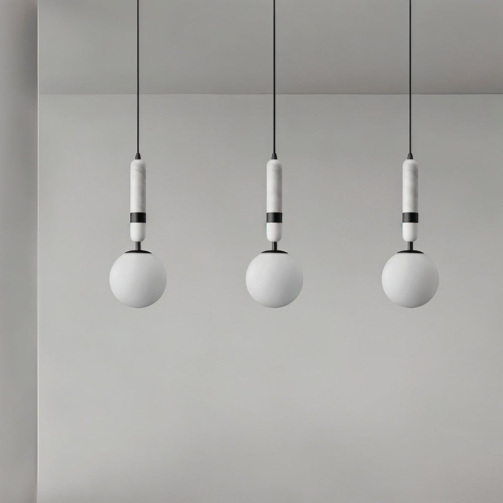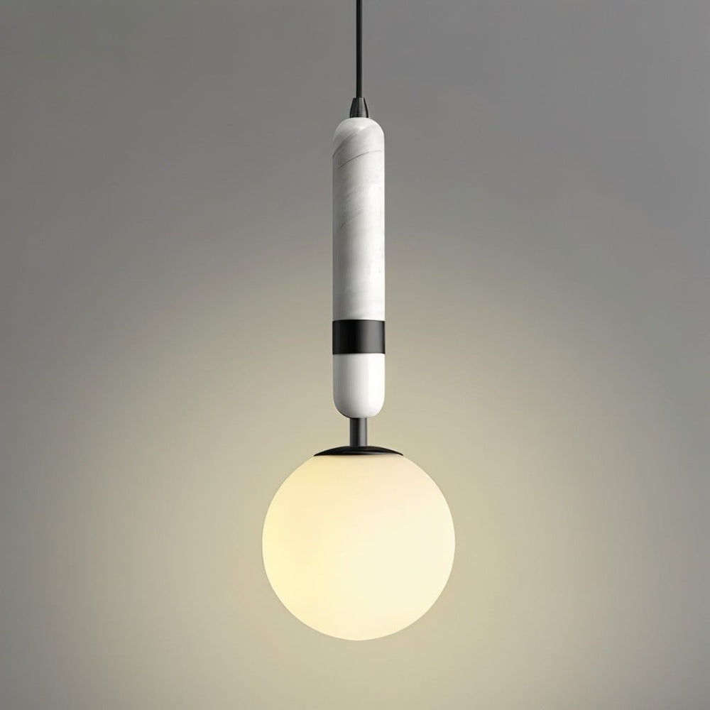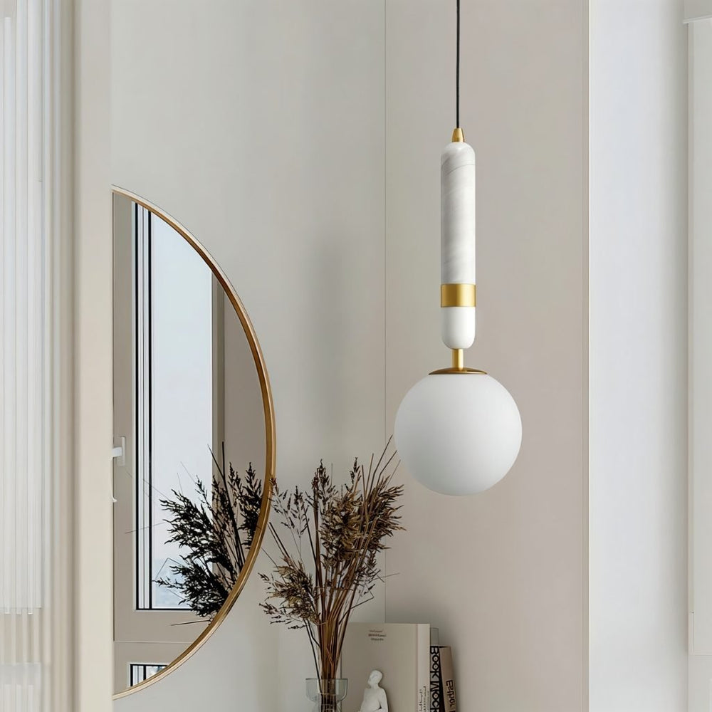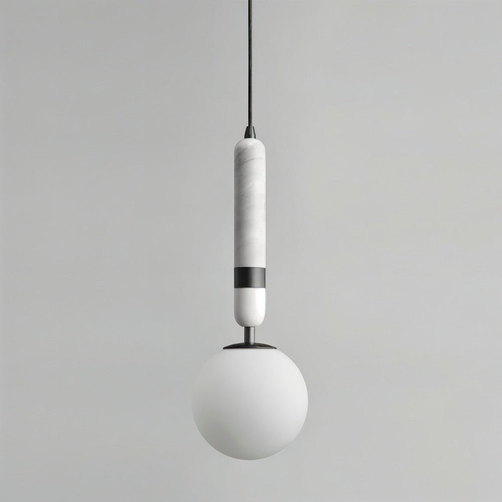 The Marlo pendant light fixture features a cylindrical marble top paired with warm copper accents and a frosted glass globe for soft, even illumination. The marble adds natural texture, while the copper detailing introduces a refined contrast. Its elongated vertical form complements modern and contemporary interiors. Crafted from copper, marble, and glass, this pendant light fixture is perfect for kitchen islands, dining spaces, bedside areas, or as a focal point in living rooms and hallways.