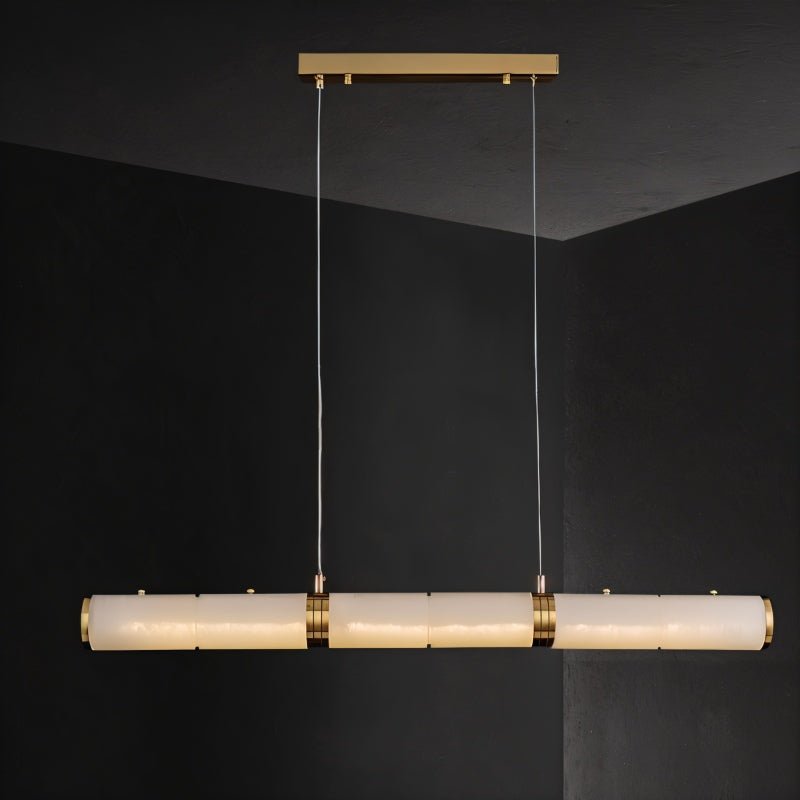 This Chandelier is perfect for the kitchen and features a simple yet striking linear design enhanced by its alabaster shade. The alabaster shade not only ensures excellent lighting but also provides a cozy and natural feel, creating a warm ambiance in your kitchen space.