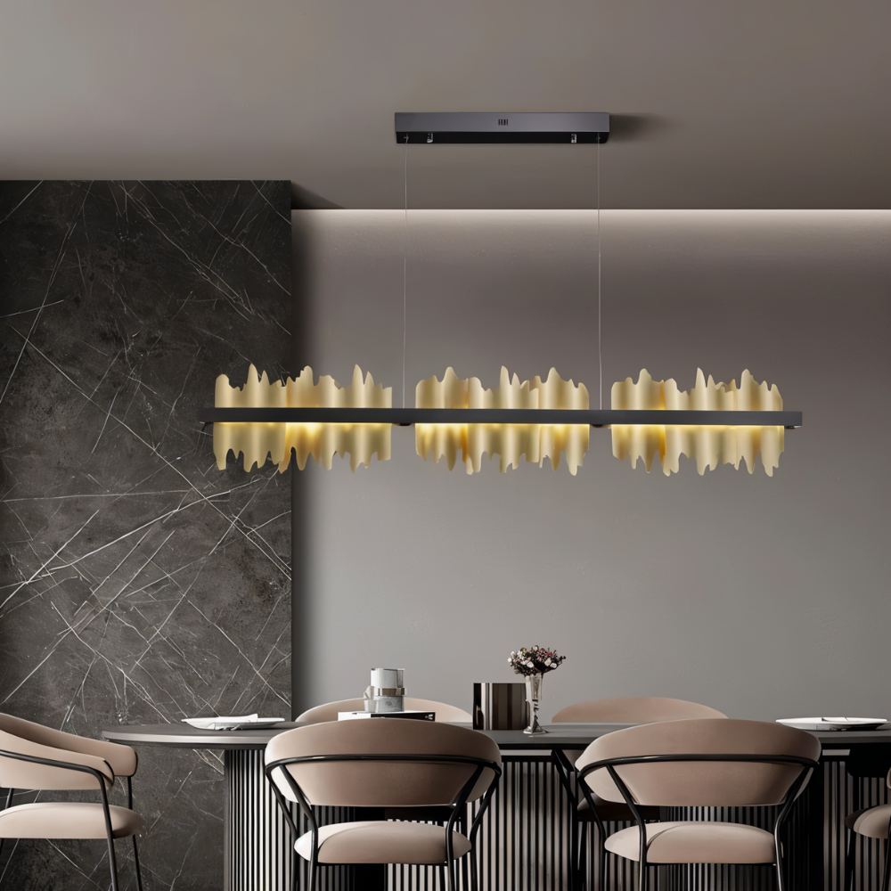 Product Dimensions: L47"(120cm) x W3.14"(8cm) x H7"(18cm) Wattage (Lumens): 45W (4950lm) Weight: 24.2 lbs Material: Copper, Acrylic Finish: Gold, Black Light Source: Integrated LED Dimmable: Yes (Optional) Voltage: 90-260VAC Installation Type: Hardwired Chain/Cord Length: Up to 3.9ft (1.2 meter) Adjustable Cord: Yes Canopy/Backplate Dimensions: L14"(41cm) Sloped Ceiling Compatible?: Upon Request Certifications: UL, CCC, CE, CQC, EMC, FCC, GS, LVD, PSE, ROHS, SAA, and VDE