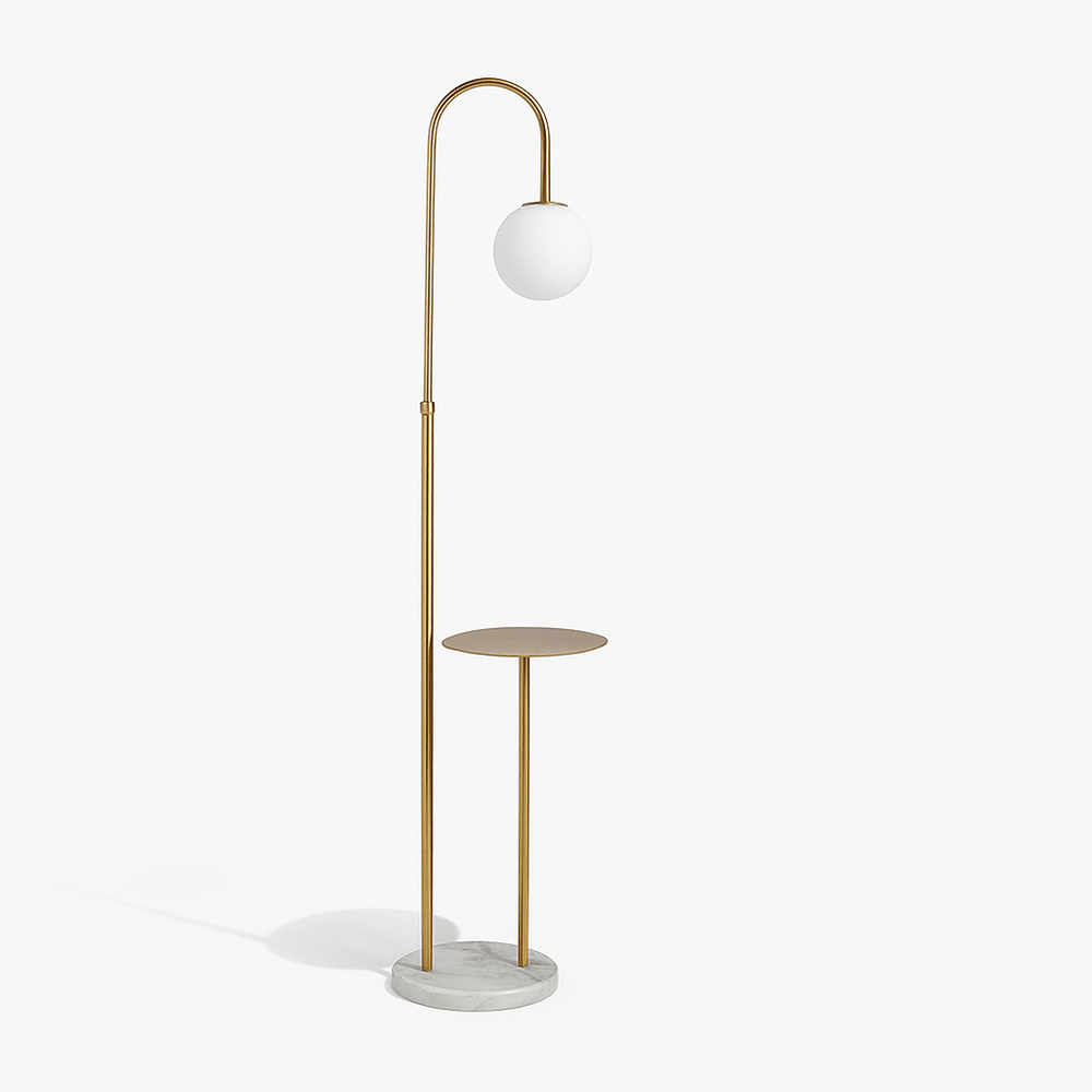 The Okul Floor Lamp With Smart Side Table is constructed with a solid marble base and offers options for the side table in wooden, iron, or white marble materials.