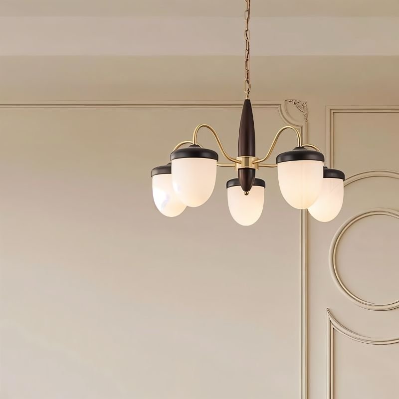 The Ombril Chandelier is made from premium brass, wood, and frosted glass for a sophisticated look.