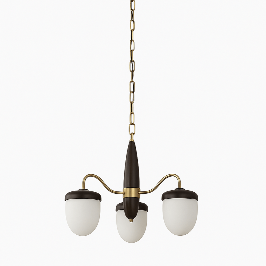 The Ombril Chandelier is a sophisticated light fixture crafted from brass, wood, and glass, available in three or five-head designs. Its curved brass arms and frosted glass shades create a balanced blend of modern and vintage aesthetics. The wooden centerpiece adds warmth, making it ideal for dining rooms, living spaces, or entryways. Suspended by a chain, it offers adjustable height for various ceiling types. Perfect for enhancing both contemporary and classic interiors.